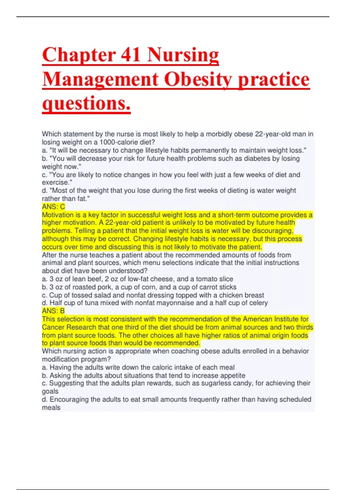 ANS: C Motivation is a key factor in successful weight loss and a short-term outcome provides a higher motivation. A 22-year-old patient is unlikely to be motivated by future health problems. Telling a patient that the initial weight loss is water will be discouraging, although this may be correct. Changing lifestyle habits is necessary, but this process occurs over time and discussing this is not likely to motivate the patient. After the nurse teaches a patient about the recommended amounts of foods from animal and plant sources, which menu selections indicate that the initial instructions about diet have been understood? a. 3 oz of lean beef, 2 oz of low-fat cheese, and a tomato slice b. 3 oz of roasted pork, a cup of corn, and a cup of carrot sticks c. Cup of tossed salad and nonfat dressing topped with a chicken breast d. Half cup of tuna mixed with nonfat mayonnaise and a half cup of celery ANS: B This selection is most consistent with the recommendation of the American Institute for Cancer Research that one third of the diet should be from animal sources and two thirds from plant source foods. The other choices all have higher ratios of animal origin foods to plant source foods than would be recommended. Which nursing action is appropriate when coaching obese adults enrolled in a behavior modification program? a. Having the adults write down the caloric intake of each meal b. Asking the adults about situations that tend to increase appetite c. Suggesting that the adults plan rewards, such as sugarless candy, for achieving their goals d. Encouraging the adults to eat small amounts frequently rather than having scheduled