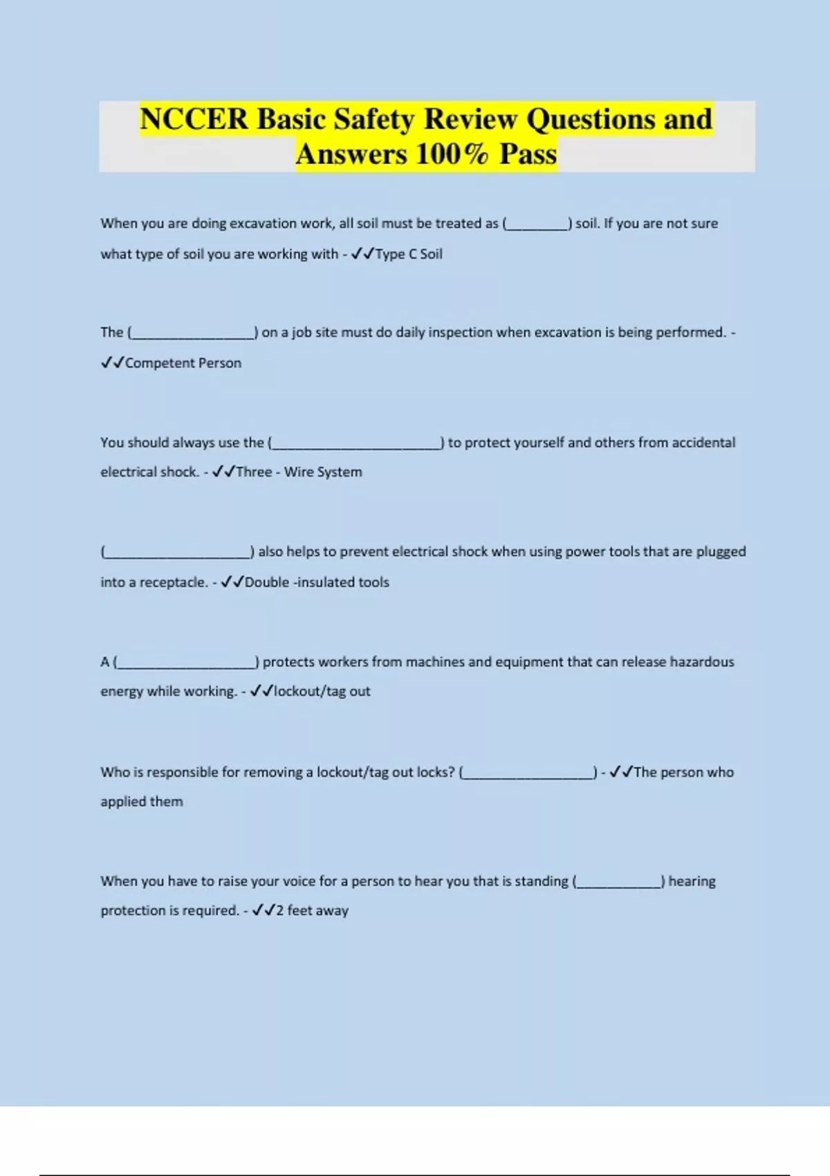When you are doing excavation work, all soil must be treated as (________) soil. If you are not sure what type of soil you are working with - Type C Soil The (________________) on a job site must do daily inspection when excavation is being performed. - Competent Person You should always use the (______________________) to protect yourself and others from accidental electrical shock. - Three - Wire System (___________________) also helps to prevent elec