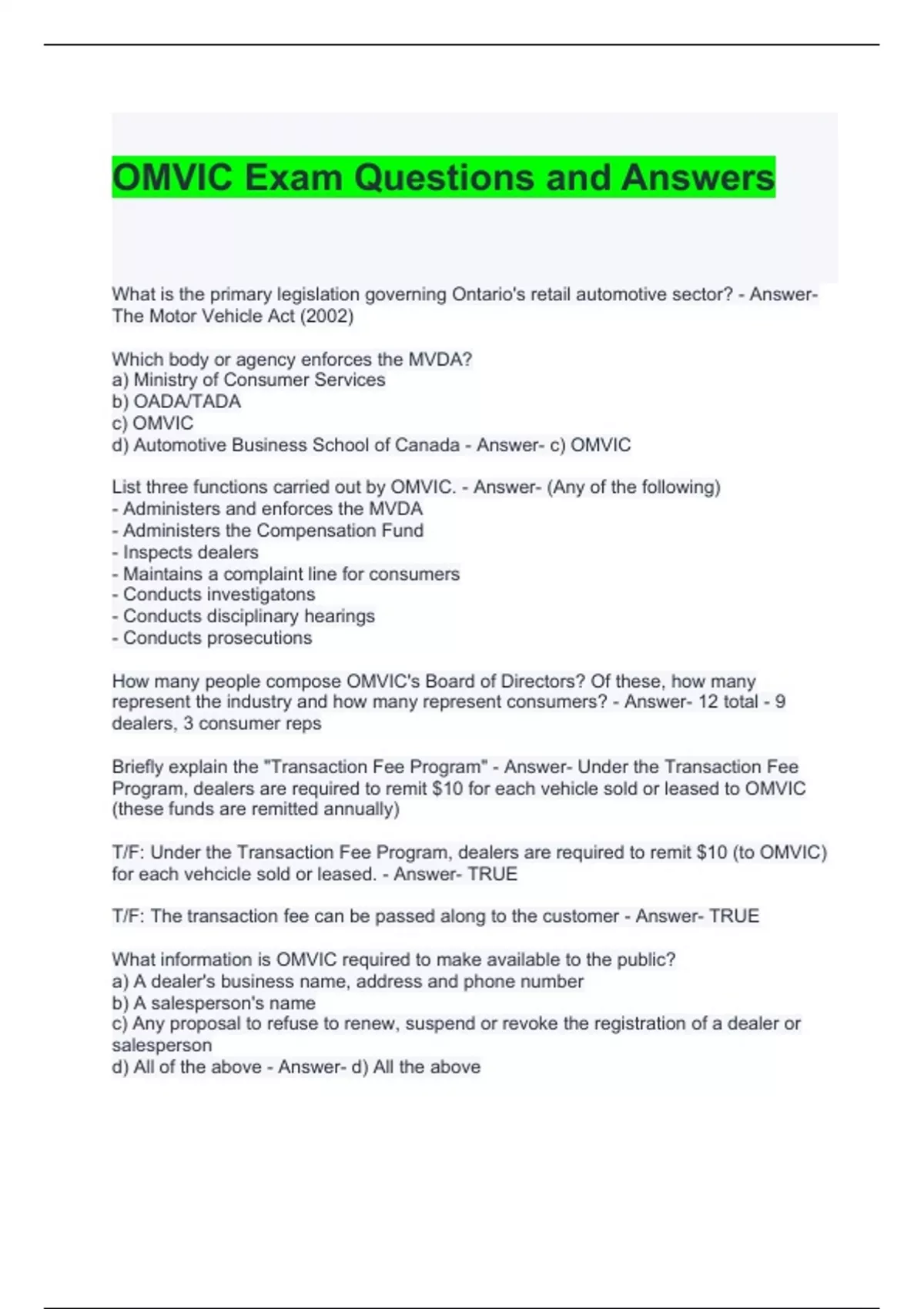 OMVIC Exam Questions and Answers