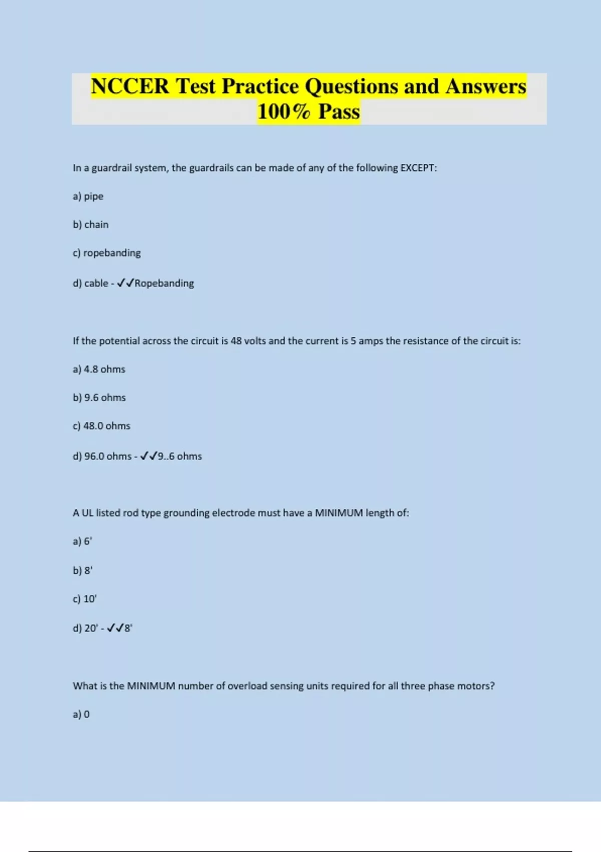 In a guardrail system, the guardrails can be made of any of the following EXCEPT: a) pipe b) chain c) ropebanding d) cable - Ropebanding If the potential across the circuit is 48 volts and the current is 5 amps the resistance of the circuit is: a) 4.8 ohms b) 9.6 ohms c) 48.0 ohms d) 96.0 ohms - 9..6 ohms A UL listed rod type grounding ele