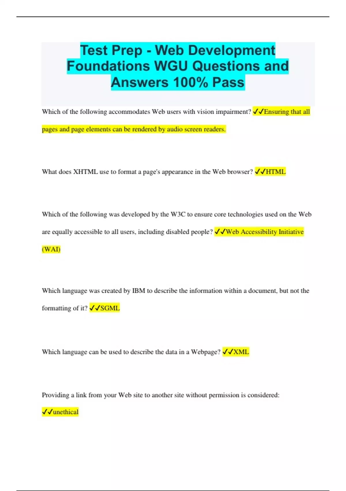Test Prep - Web Development Foundations WGU Questions and Answers 100% Pass Which of the following accommodates Web users with vision impairment? Ensuring that all pages and page elements can be rendered by audio screen readers. What does XHTML use to format a page's appearance in the Web browser? HTML Which of the following was developed by the W3C to ensure core technologies used on the Web are equally accessible to all users, including disabled people? Web Accessibility Initiative (WAI) Which language was created by IBM to describe the information within a document, but not the formatting of it? SGML Which language can be used to describe the data in a Webpage? XML Providing a link from your Web site to another site without permission is considered: unethical Which issue is like to happen when you specify a particular font in an HTML Webpage? Some browsers may render your Webpages improperly. Which HTML 4.01 flavor must you use to place Webpages inside each other to create panes in the browser window? HTML 4.01 Frameset Which of the following is an American with Disabilities Act (ADA) compliance factor? You must provide text-based alternatives to all non-text content (e.g., Java applets). Which of the following can you use to create a markup language code? A text editor You have a contract job to create Webpages in HTML for a company based in Canada. How can you ensure usability as defined by the Canadian government for this company's disabled website users? Create pages according to acts passed by the Canadian government. When conducting a Web development project meeting, why might it be useful to have a third party deliver a summary of progress? A third party may help ensure clarity in meetings that include technical and non-technical participants. Which of the following is an element of an initial Website plan? Storyboard Which of the following accommodates Web users with vision impairment? Ensuring that all pages and page elements can be rendered by audio screen readers. After several meetings, your team's Web site plan has been developed. Which step is now necessary? Documenting the decisions for approval by all parties. Which activity is most likely to be necessary during a Website planning meeting? Explaining branding issues to members of the Web development team. What is the best source from which you can obtain feedback about your website to evaluate the site's effectiveness and determine ways you can improve the site? Sales representatives Why should you be sure to articulate the steps of the project cycle during a Web development project? To facilitate working closely with individuals and teams of individuals. What can you do to ensure continued attention when presenting your team's Website plan to upper management during a meeting? Use presentation software. Which step can most directly help your team follow up on decisions made during Web development meetings? Creating a list of action items and distributing minutes. Why might you consider using presentation tools