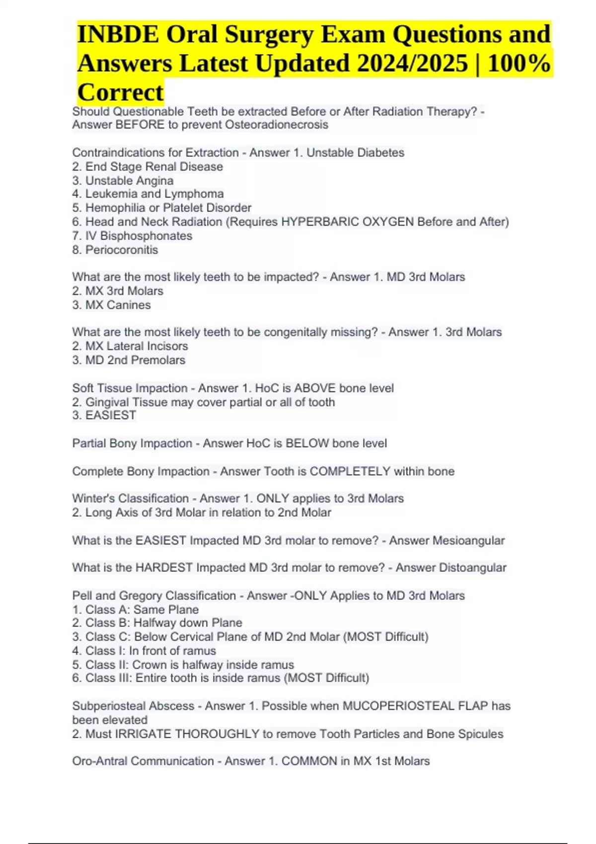 Should Questionable Teeth be extracted Before or After Radiation Therapy? - Answer BEFORE to prevent Osteoradionecrosis Contraindications for Extraction - Answer 1. Unstable Diabetes 2. End Stage Renal Disease 3. Unstable Angina 4. Leukemia and Lymphoma 5. Hemophilia or Platelet Disorder 6. Head and Neck Radiation (Requires HYPERBARIC OXYGEN Before and After) 7. IV Bisphosphonates 8. Periocoronitis What are the most likely teeth to be impacted? - Answer 1. MD 3rd Molars 2. MX 3rd Molars 3. MX Canines What are the most likely teeth to be congenitally missing? - Answer 1. 3rd Molars 2. MX Lateral Incisors 3. MD 2nd Premolars Soft Tissue Impaction - Answer 1. HoC is ABOVE bone level 2. Gingival Tissue may cover partial or all of tooth 3. EASIEST Partial Bony Impaction - Answer HoC is BELOW bone level Complete Bony Impaction - Answer Tooth is COMPLETELY within bone Winter's Classification - Answer 1. ONLY applies to 3rd Molars 2. Long Axis of 3rd Molar in relation to 2nd Molar What is the EASIEST Impacted MD 3rd molar to remove? - Answer Mesioangular What is the HARDEST Impacted MD 3rd molar to remove? - Answer Distoangular Pell and Gregory Classification - Answer -ONLY Applies to MD 3rd Molars 1. Class A: Same Plane 2. Class B: Halfway down Plane 3. Class C: Below Cervical Plane of MD 2nd Molar (MOST Difficult) 4. Class I: In front of ramus 5. Class II: Crown is halfway inside ramus 6. Class III: Entire tooth is inside ramus (MOST Difficult) Subperiosteal Abscess - Answer 1. Possible when MUCOPERIOSTEAL FLAP has been elevated 2. Must IRRIGATE THOROUGHLY to remove Tooth Particles and Bone Spicules Oro-Antral Communication - Answer 1. COMMON in MX 1st Molars INBDE Oral Surgery Exam Questions and Answers Latest Updated 2024/2025 | 100% Correct 2. Can be prevented with good pre-op radiograph and MINIMAL Apical Pressure What to do if Oro-Antral Communication is less than 2mm? - Answer Monitor What to do if Oro-Antral Communication is 2-6mm? - Answer 1. 4As (Antibiotics, Antihistamines, Analgesics and Afrin Nasal Spray) 2. Figure-Eight Suture. What to do if Oro-Antral Communication is greater than 6mm? - Answer Surgical Flap Surgery Alveolar Osteitis - Answer 1. "Dry Socket" 2. Blood Clot falls out WITHIN 3 DAYS after surgery BEFORE wound heals 3. Does NOT require Antibiotics 4. Requires Irrigation and Palliative Control Nerve Injury - Answer 1. MOST COMMON with MD 3rd Molars 2. Txt is Medrol Dosepak (Methyprednisolone) for Inflammation 3. If lasting for MORE THAN 4 Weeks, should have Microneurosurgical Eval Where are MX 1st/2nd Molars most likely to displace? - Answer Sinus Where are MX 3rd Molars most likely to displace? - Answer Infratemporal Fossa Where are MD 3rd Molars most likely to displace? - Answer Submandibular Space #9 Molt Periosteal Elevator - Answer Larger than Woodson Periosteal Straight Elevator (#301) - Answer 1. MOST COMMON 2. LEVER 3. Blade has CONCAVE Surface that should be pointed towards EXTRACTION Tooth Triangular Elevator (Cryer) - Answer 1. 2nd Most Common 2. WHEEL and AXEL 3. Used to remove BROKEN ROOTS Pick Elevator - Answer 1. Used to remove BROKEN or RETAINED Roots 2. WEDGE 3. CRANE Pick is HEAVY Version 4. ROOT TIP Pick is DELICATE Version #150 Universal Forceps - Answer 1. Upper 2. A = Premolars 3. S = Primary #151 Universal Forceps - Answer 1. Lower 2. A = Premolars 3. S = Primary #23 Lower Cowhorn Forceps - Answer 1. MD Molars 2. 2 Sharp Beaks 3. Used to engage BIFURCATION #88 Upper Cowhorn Forceps - Answer 1. MX Molars 2. 2 Beaks engage Palatal Root 3. 1 Beak engages Buccal Bifurcation #74 Ash Forceps - Answer Used for MD Premolars #15 Blade - Answer MOST COMMON for Intraoral Incisions #11 Blade - Answer For Stab Incisions #10 Blade - Answer Large Skin Incisions #12 Blade - Answer 1. Mucogingival Surgery 2. Curved Blade EASES access of sulcus Rongeurs - Answer Remove INTERRADICULAR Bone in SMALL "Bites" Osteotome - Answer 1. Bone Chisel 2. The flat end is tapped using a mallet 3. Monobevel: Used to remove Tori 4. Bibevel: Used to section Tooth Bone File - Answer Must use PULL STROKES to SMOOTHEN bone Hemostat - Answer 1. Designed to CLAMP BVs 2. Can also be used during Incision and Drainage to open Abscess 3. Beaks are STRAIGHT-HATCHED 4. Beaks are LONGER and THINNER Needle Holder - Answer 1. Beaks are CROSS-HATCHED 2. Beaks are SHORTER and THICKER What is the primary purpose of sutures? - Answer IMMOBILIZE Flap In which direction should sutures be moved through? - Answer From MOVEABLE Tissues to IMMOVEABLE Tissues What is the MOST COMMON suture technique? - Answer Simple Interrupted Interrupted Suture Techniques - Answer 1. Simple 2. Criss-Cross (Used to HOLD whatever is placed inside Socket) Mattress Technique - Answer 1. RESISTS Muscle Pull 2. EVERTS Wound Edges to pull Epithelium AWAY from Underlying Structures 3. Allows Epithelium to CLOSELY Adapt to Underlying Bone Graft or Membrane 4. Used during Implant Why should silk sutures not be used? - Answer Has WICKING Property that allows bacteria to INVADE the threads via CAPILLARY ACTION Purchase Point - Answer Space BETWEEN Tooth and Alveolar Bone that can be used to ANCHOR Elevator and provide Fulcrum Outward Forcep Movement - Answer Initial Movement for PERMANENT Teeth Inward Forcep Movement - Answer Initial Movement for PRIMARY Teeth Rotary Forcep Movement - Answer Initial Movement for CONICAL Roots Apical Forcep Movement - Answer 1. Applied for EVERY Tooth 2. Exercise CAUTION with MX Molars After Extraction - Answer 1. Apply force against bone walls with fingers to REVERSE Expansion and AVOID Undercuts 2. Curette 3. Smoothen Bone 4. Irrigate Envelope Flap - Answer 1. Mucoperiosteal Flap 2. NO Vertical Releases 3-Cornered Flap - Answer 1. Mucoperiosteal Flap 2. ONE Vertical Release Trapezoidal Flap - Answer 1. Mucoperiosteal Flap 2. TWO Vertical Releases Semilunar Flap - Answer 1. BELOW Mucogingival Junction 2. For APICOECTOMY Surgeries 3. ONLY on the Labial Tissue since Palatal Tissue is ATTACHED Double Y