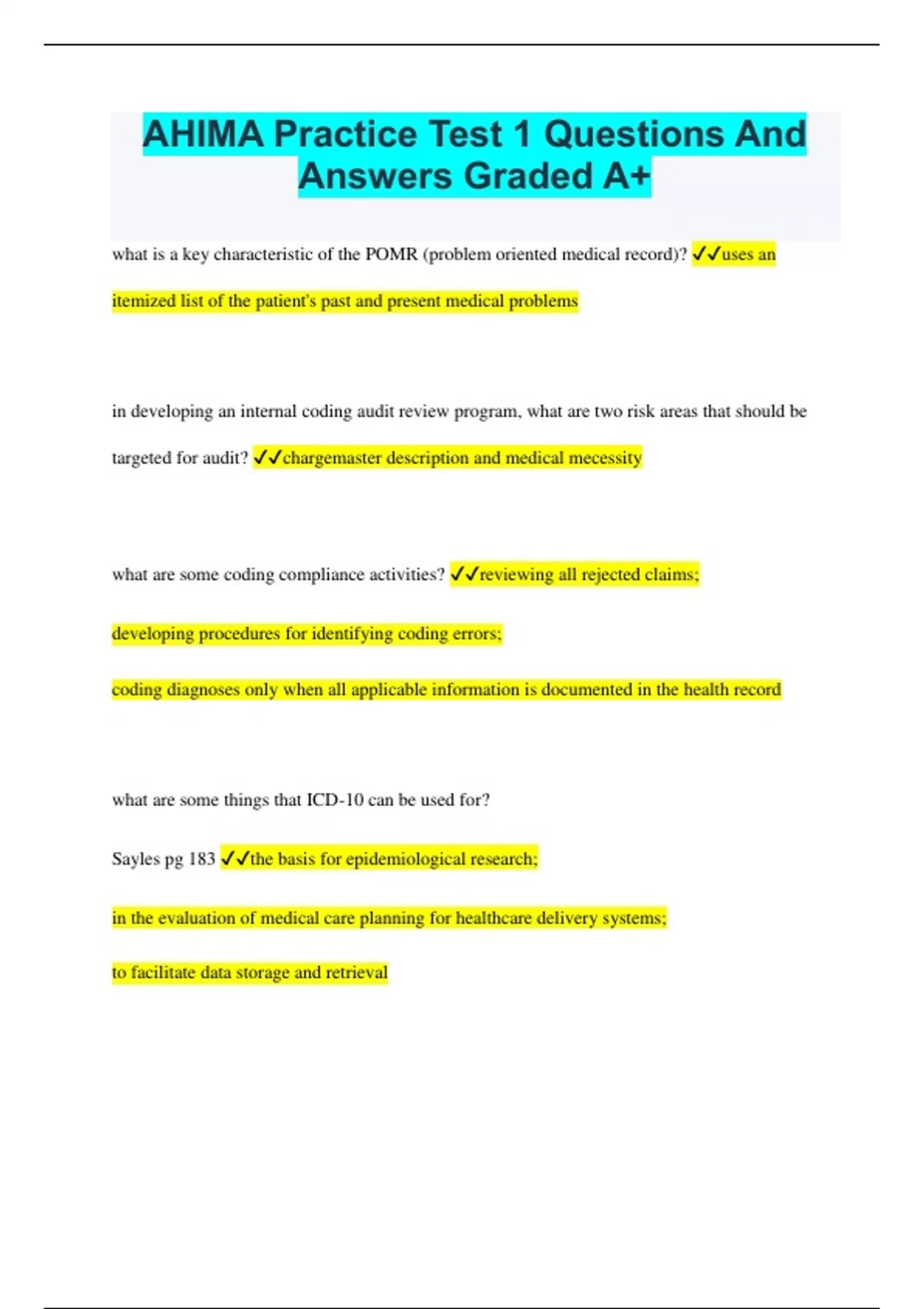 AHIMA Practice Test 1 Questions And Answers Graded A+ what is a key characteristic of the POMR (problem oriented medical record)? uses an itemized list of the patient's past and present medical problems in developing an internal coding audit review program, what are two risk areas that should be targeted for audit? chargemaster description and medical mecessity what are some coding compliance activities? reviewing all rejected claims; developing procedures for identifying coding errors; coding diagnoses only when all applicable information is documented in the health record what are some things that ICD-10 can be used for? Sayles pg 183 the basis for epidemiological research; in the evaluation of medical care planning for healthcare delivery systems; to facilitate data storage and retrieval a skin lesion was removed from a patient's cheek in the dermatologist's office. The dermatologist documents "skin lesion" in the health record. Prior to billing the pathology report returns with a diagnosis of basal cell carcinoma? what action should be done by the coding professional for claim submission? cpt pg376 code basal cell carcinoma what is the approved method for conducting business in an organization? Sayles pg 408 procedure prcedres are specific statements about how work is to be carried out. data that are collected on large populations of individuals and stored in databases are referred to as____ Sayles pg 41 aggregate data aggregate data is extracted from individual health records and combined to form deidentified information about groups of patients that can be compared and organized the hospital's performance improvement council has compiled the following data on the volume of procedures performed during 2008. Given this data, which procedures should the council scrutinize in evaluating performance? quality pg 374 the outliers; the initiation phase begins with the determination that a gap exists between organization performance and expected outcomes