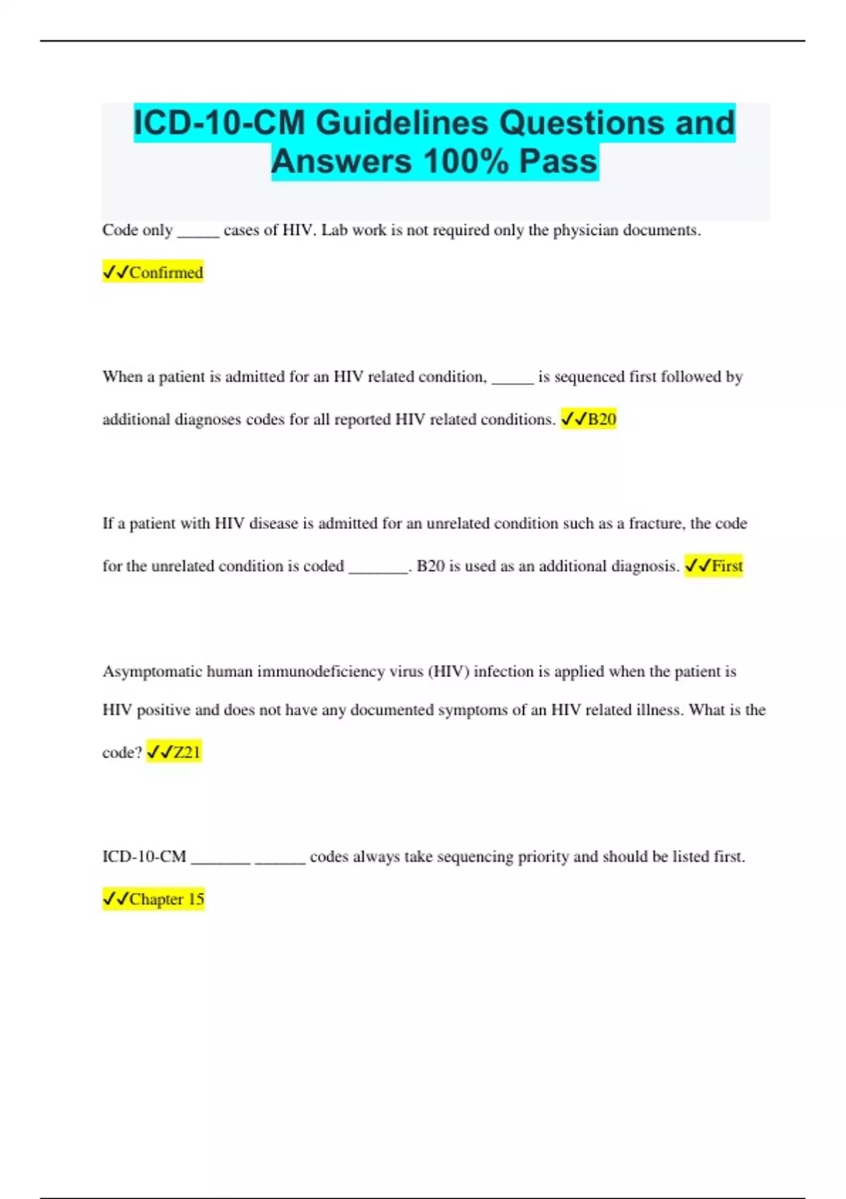 ICD-10-CM Guidelines Questions and Answers 100% Pass Code only _____ cases of HIV. Lab work is not required only the physician documents. Confirmed When a patient is admitted for an HIV related condition, _____ is sequenced first followed by additional diagnoses codes for all reported HIV related conditions. B20 If a patient with HIV disease is admitted for an unrelated condition such as a fracture, the code for the unrelated condition is coded _______. B20 is used as an additional diagnosis. First Asymptomatic human immunodeficiency virus (HIV) infection is applied when the patient is HIV positive and does not have any documented symptoms of an HIV related illness. What is the code? Z21 ICD-10-CM _______ ______ codes always take sequencing priority and should be listed first. Chapter 15 Should a patient with signs and symptoms is being seen for HIV testing, what should be coded while waiting on the results? Signs and symptoms If a patient test results come back positive for HIV and the patient is symptomatic, what code should be used? B20 Sepsis and severe sepsis require a code to identify the ________ _________. If documentation does not include the casual organism, report A41.9 Sepsis, unspecified organism. Systematic infection Severe sepsis is associated with acute organ dysfunction. A minimum of two codes are required. Code underlying condition first, followed by a code from subcategory ______ depending on what is documented. R65.2 Code ____ can never be used as principal diagnosis. R65.2 When coding septic shock, first code the systemic infection followed by R65.21 or Organ function When the patient develops anemia because of the neoplasm and presents for treatment of the anemia, the code for the ________ is listed first, followed by the code for the ______. Malignancy, anemia If the anemia is caused by chemotherapy or radiotherapy, the _______ code is reported first, followed by the appropriate codes for the _____________________. Anemia, neoplasm and the adverse effect When coding an encounter for chemotherapy, immunotherapy, and radiotherapy, report the ___________ first, followed by the active code for the ___________________________, even if that neoplasm has already been removed. Z codes, malignant neoplasm _______________ is a type of diabetes caused by something other than genetics or environmental factors. It is always caused by another condition or event. Secondary diabetes _________ is the paralysis of both lower limbs. Paraplegia _________ is paralysis of all four limbs. Quadriplegia _________ is paralysis on one vertical half of the body. Hemiplegia __________ is paralysis of one limb. Monoplegia __________ is a condition when the optic nerve is damaged, causing vision loss. Glaucoma ________________ is any inflammation of the middle ear without reference to etiology or pathogenesis. Otitis media (OM) What code should be used to report weeks of gestation? Z38 Should a condition originate in the perinatal period, and continue throughout the life of the patient, should the Perinatal code be used throughout the life of the patient of or should the perinatal code be discontinued after delivery. Throughout life of the patient Coding of sequela generally requires two codes sequenced in the following order: _____________________________________________. the condition or nature of the sequela is sequenced first. The sequela code is sequenced second. Manifestation Signs and/or symptoms of an underlying disease, not the disease itself, and therefore, cannot be a principal diagnosis. Excludes 1 It means "NOT CODED HERE!" An Excludes1 note indicates that the code excluded should never be used at the same time