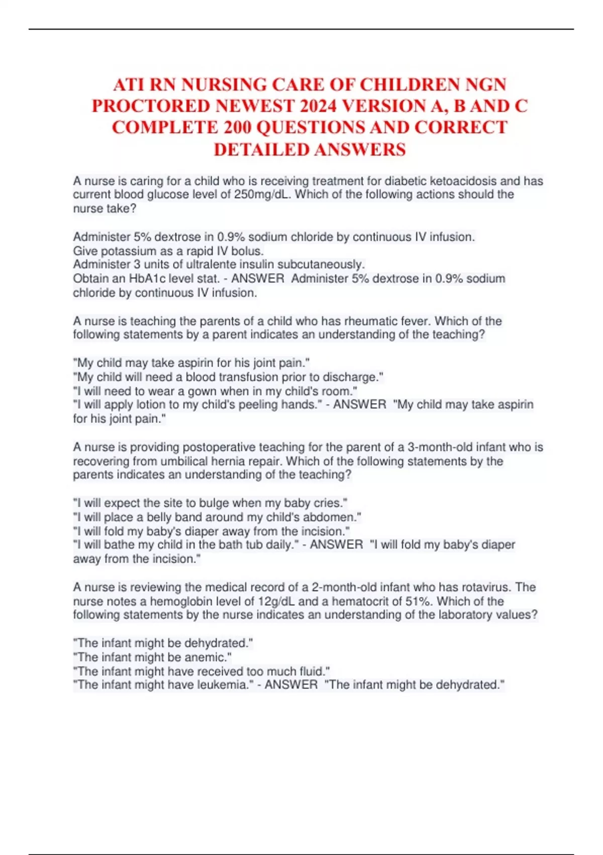 ATI RN NURSING CARE OF CHILDREN NGN PROCTORED NEWEST 2024 VERSION A, B AND C COMPLETE 200 QUESTIONS AND CORRECT DETAILED ANSWERS A nurse is caring for a child who is receiving treatment for diabetic ketoacidosis and has current blood glucose level of 250mg/dL. Which of the following actions should the nurse take? Administer 5% dextrose in 0.9% sodium chloride by continuous IV infusion. Give potassium as a rapid IV bolus. Administer 3 units of ultralente insulin subcutaneously. Obtain an HbA1c level stat. - ANSWER Administer 5% dextrose in 0.9% sodium chloride by continuous IV infusion. A nurse is teaching the parents of a child who has rheumatic fever. Which of the following statements by a parent indicates an understanding of the teaching? "My child may take aspirin for his joint pain." "My child will need a blood transfusion prior to discharge." "I will need to wear a gown when in my child's room." "I will apply lotion to my child's peeling hands." - ANSWER "My child may take aspirin