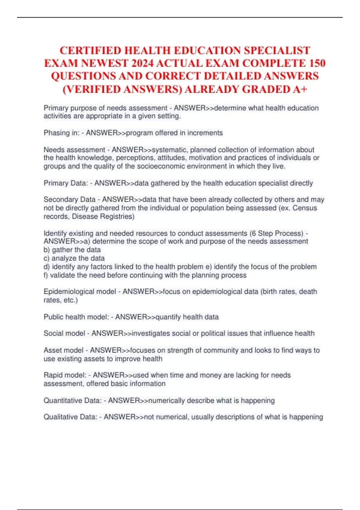 CERTIFIED HEALTH EDUCATION SPECIALIST EXAM NEWEST 2024 ACTUAL EXAM COMPLETE 150 QUESTIONS AND CORRECT DETAILED ANSWERS (VERIFIED ANSWERS) ALREADY GRADED A+