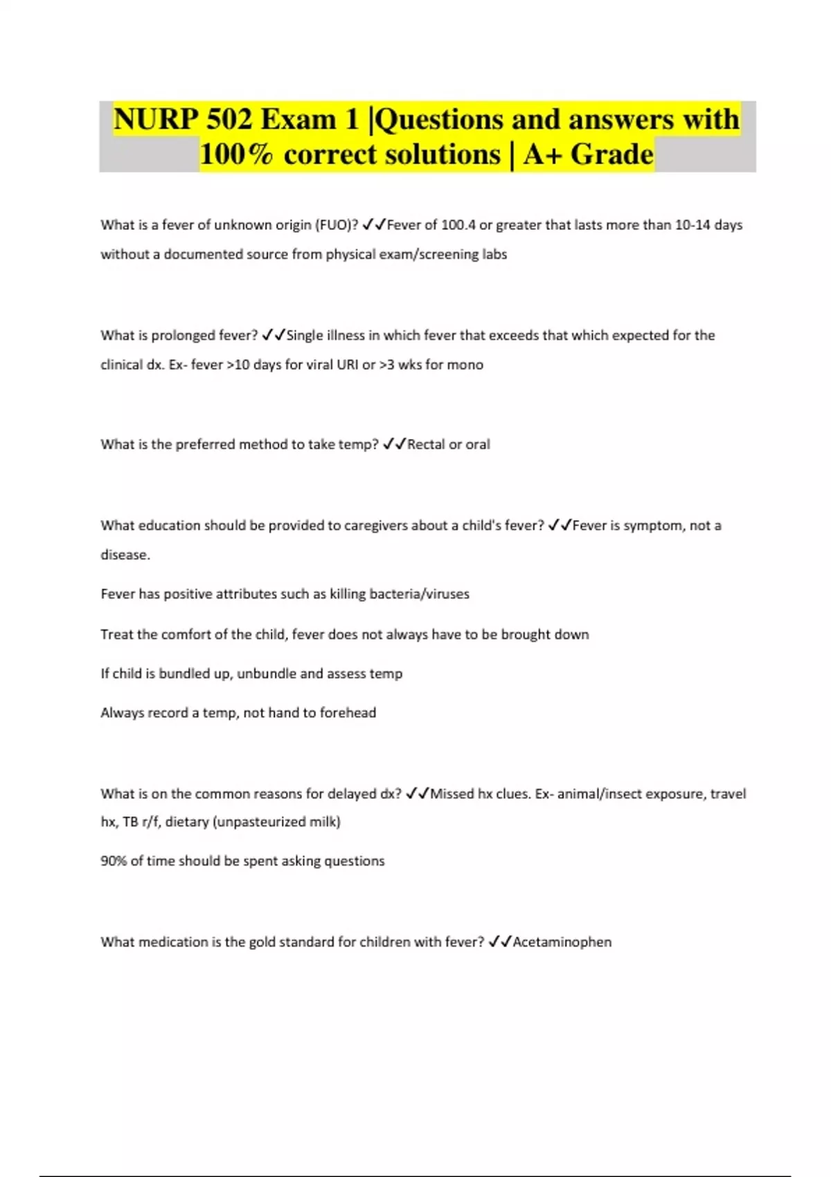 What is a fever of unknown origin (FUO)? Fever of 100.4 or greater that lasts more than 10-14 days without a documented source from physical exam/screening labs What is prolonged fever? Single illness in which fever that exceeds that which expected for the clinical dx. Ex- fever >10 days for viral URI or >3 wks for mono What is the preferred method to take temp? Rectal or oral What education should be provided to caregivers about a child's fever? Fever is symptom, not a disease. Fever has positive attributes such as killing bacteria/viruses Treat the comfort of the child, fever does not always have to be brought down If child is bundled up, unbundle and assess temp