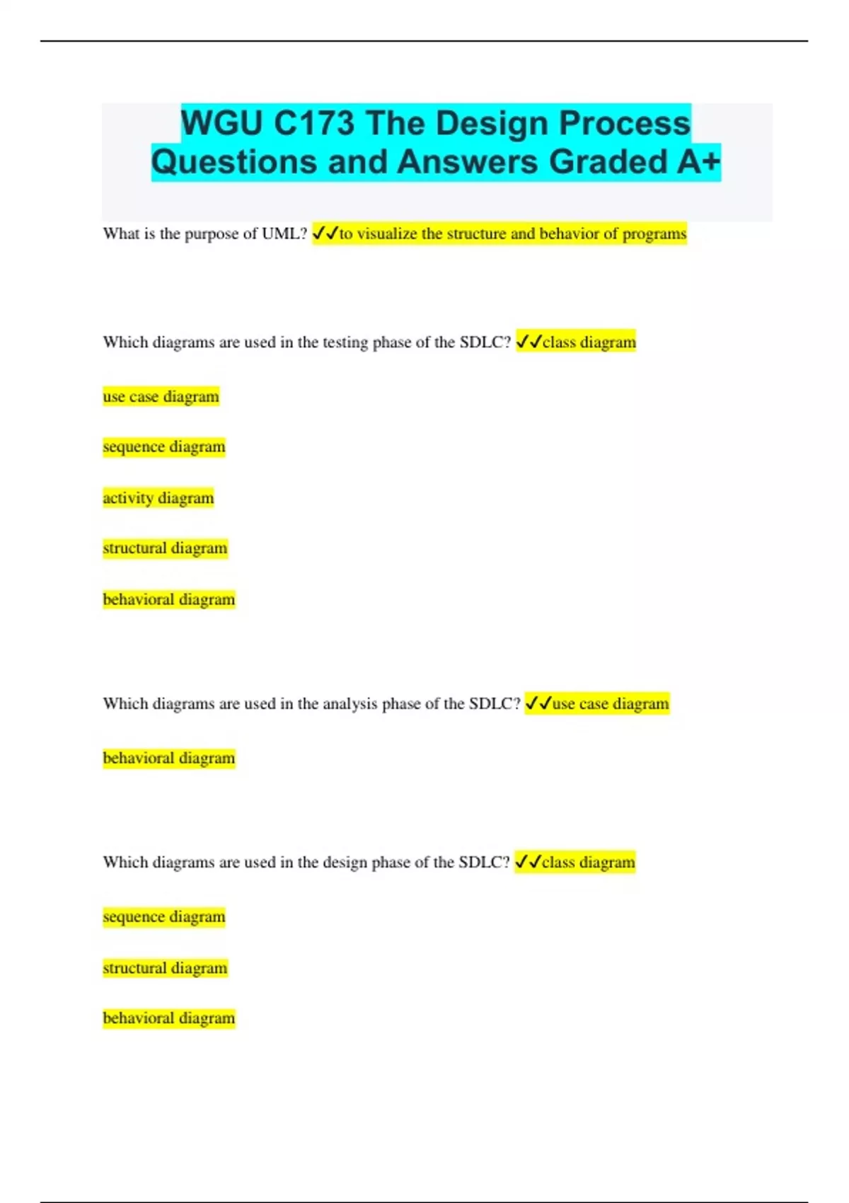 WGU C173 The Design Process Questions and Answers Graded A+ What is the purpose of UML? to visualize the structure and behavior of programs Which diagrams are used in the testing phase of the SDLC? class diagram use case diagram sequence diagram activity diagram structural diagram behavioral diagram Which diagrams are used in the analysis phase of the SDLC? use case diagram behavioral diagram Which diagrams are used in the design phase of the SDLC? class diagram sequence diagram structural diagram behavioral diagram Which diagrams are used in the implementation phase of the SDLC? activity diagram In which software design phase do you write code? implementation What is the purpose of a structural diagram? To visualize static elements of software. What is the purpose of a behavioral diagram? To visualize the dynamic behavior of software. What is the purpose of an activity diagram? To visualize the flow of an activity. Which design phases are a part of the agile process? analysis design implementation testing Which design phases are a part of the waterfall process? analysis testing design implementation Which design process is easy to arrange tasks, has clearly defined stages, and phases are processed and completed one at a time? Waterfall Which design process promotes teamwork and cross-training, is easy to manage, and delivers early work? Agile Which design process has high amounts of risk and uncertainty? Waterfall Which design process depends heavily on customer interaction? Agile Which design process has more risk of sustainability, maintainability, and extensibility? Waterfall This approach may be difficult to maintain at the rate needed, or repaired properly if changes are needed along the way. Because each phase is only visited once, it doesn't easily allow for new functionality or changes to be implemented. Which design process works in a circular manner, revisiting phases multiple times? Agile In which SDLC phase do you determine what should be included? Analysis In which SDLC phase do you determine what should be included in the code? Design In which SDLC phase do you decide how processes should work? Design In which SDLC phase do you determine if the code works functionally? Implementation In which SDLC phase do you determine if the code