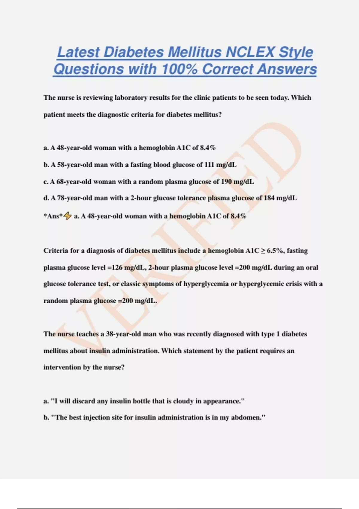 Latest Diabetes Mellitus NCLEX Style Questions with 100% Correct Answers The nurse is reviewing laboratory results for the clinic patients to be seen today. Which patient meets the diagnostic criteria for diabetes mellitus? a. A 48-year-old woman with a hemoglobin A1C of 8.4% b. A 58-year-old man with a fasting blood glucose of 111 mg/dL c. A 68-year-old woman with a random plasma glucose of 190 mg/dL d. A 78-year-old man with a 2-hour glucose tolerance plasma glucose of 184 mg/dL *Ans* a. A 48-year-old woman with a hemoglobin A1C of 8.4% Criteria for a diagnosis of diabetes mellitus include a hemoglobin A1C ≥ 6.5%, fasting plasma glucose level =126 mg/dL, 2-hour plasma glucose level =200 mg/dL during an oral glucose tolerance test, or classic symptoms of hyperglycemia or hyperglycemic crisis with a random plasma glucose =200 mg/dL. The nurse teaches a 38-year-old man who was recently diagnosed with type 1 diabetes mellitus about insulin administration. Which statement by the patient requires an intervention by the nurse? a. "I will discard any insulin bottle that is cloudy in appearance." b. "The best injection site for insulin administration is in my abdomen." c. "I can wash the site with soap and water before insulin administration." d. "I may keep my insulin at room temperature (75o F) for up to a month." *Ans* a. "I will discard any insulin bottle that is cloudy in appearance." Intermediate-acting insulin and combination premixed insulin will be cloudy in appearance. Routine hygiene such as washing with soap and rinsing with water is adequate for skin preparation for the patient during self-injections. Insulin vials that the patient is currently using may be left at room temperature for up to 4 weeks unless the room temperature is higher than 86° F (30° C) or below freezing (less than 32° F [0° C]). Rotating sites to different anatomic sites is no longer recommended. Patients should rotate the injection within one particular site, such as the abdomen. The nurse instructs a 22-year-old female patient with diabetes mellitus about a healthy eating plan. Which statement made by the patient indicates that teaching was successful? a. "I plan to lose 25 pounds this year by following a high-protein diet." b. "I may have a hypoglycemic reaction if I drink alcohol on an empty stomach." c. "I should include more fiber in my diet than a person who does not have diabetes." d. "If I use an insulin pump, I will not need to limit the amount of saturated fat in my diet." *Ans* b. "I may have a hypoglycemic reaction if I drink alcohol on an empty stomach." The risk for alcohol-induced hypoglycemia is reduced by eating carbohydrates when drinking alcohol. Intensified insulin therapy, such as the use of an insulin pump, allows