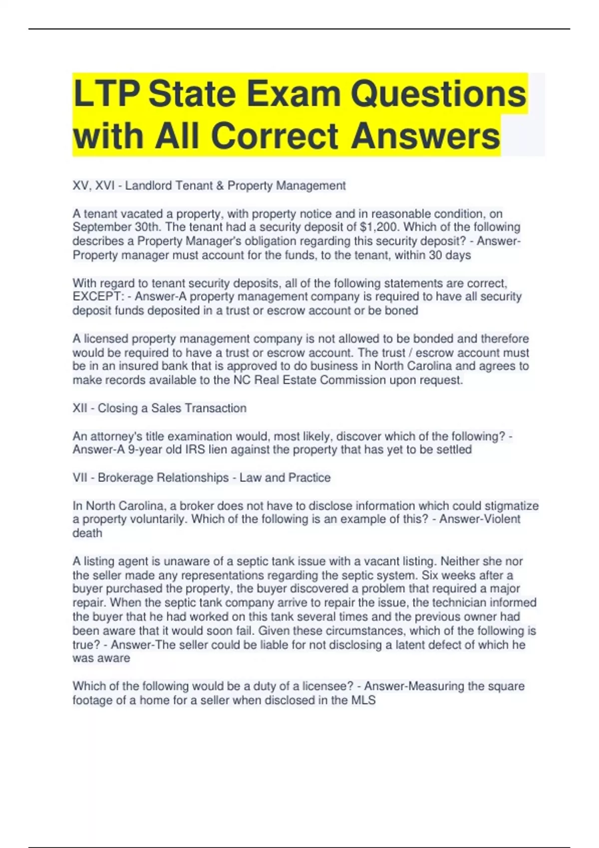 LTP State Exam Questions with All Correct Answers XV, XVI - Landlord Tenant & Property Management A tenant vacated a property, with property notice and in reasonable condition, on September 30th. The tenant had a security deposit of $1,200. Which of the following describes a Property Manager's obligation regarding this security deposit? - Answer- Property manager must account for the funds, to the tenant, within 30 days With regard to tenant security deposits, all of the following statements are correct, EXCEPT: - Answer-A property management company is required to have all security deposit funds deposited in a trust or escrow account or be boned A licensed property management company is not allowed to be bonded and therefore would be required to have a trust or escrow account. The trust / escrow account must be in an insured bank that is approved to do business in North Carolina and agrees to make records available to the NC Real Estate Commission upon request. XII - Closing a Sales Transaction An attorney's title examination would, most likely, discover which of the following? - Answer-A 9-year old IRS lien against the property that has yet to be settled VII - Brokerage Relationships - Law and Practice In North Carolina, a broker does not have to disclose information which could stigmatize a property voluntarily. Which of the following is an example of this? - Answer-Violent death A listing agent is unaware of a septic tank issue with a vacant listing. Neither she nor the seller made any representations regarding the septic system. Six weeks after a buyer purchased the property, the buyer discovered a problem that required a major repair. When the septic tank company arrive to repair the issue, the technician informed the buyer that he had worked on this tank several times and the previous owner had been aware that it would soon fail. Given these circumstances, which of the following is true? - Answer-The seller could be liable for not disclosing a latent defect of which he was aware Which of the following would be a duty of a licensee? - Answer-Measuring the square footage of a home for a seller when disclosed in the MLS Two agents with XYZ Realty are correctly practicing dual agency as designated agents. When is the latest that a seller should be informed of the identity of the agent designated for the buyer? - Answer-At initial contact with the buyer's designated agent First substantial contact (FSC) relates to agency disclosure between an agent and a prospective client. The last point FSC can arise with a seller is prior to beginning the listing presentation. The last point that FSC occurs with a buyer is the point that the agent is opening the door for the prospective buyer. Which of the following would a listing broker be obligated to disclose to a buyer's agent? - Answer-A recent highway expansion was approved to begin construction a half a mile from the house in the next 18 months A broker that is representing the seller in a transaction is commonly acting as: - Answer- a special agent A new home community is offering a new Subaru Outback when a broker sells 3 homes within 1 year. The broker: - Answer-must disclose the bonus to all buyers no later than the point that the buyer is considering an offer A broker is representing a client at the settlement meeting under the standard NCAR Exclusive Buyer Agency Agreement. Which of the following would the broker be responsible for at the settlement meeting? - Answer-Verifying the accuracy of the contract terms on the closing disclosure Which of the following events would trigger the requirement to provide and review the Working With Real Estate Agents brochure? - Answer-Discussing a seller's motivation for placing his home on the market Which of the following statement is TRUE about agency representation? - Answer-A provisional broker and his/her broker-in-charge may act as dual agents in a transaction A licensee is representing a seller through an Exclusive Right to Sell listing agreement. At the settlement meeting the seller refuses to pay commission on the listing firm. The licensee - Answer-must advice the seller that this is a breach of the listing contract V - Land Use Control A licensee has listed a property for sale with the seller authorizing dual and designated agency. A prospective buyer expresses an interest in making an offer. The buyer has disclosed a proposed use that would violate restrictive covenants. Is the licensee required to disclose the issue to the buyer? - Answer-Yes. A licensee is required to disclose material facts to all parties to the transaction XXI - Real Estate License Law and Commission Rules A provisional broker obtains a real estate license on May 15th of the current year. The provisional broker must: - Answer-pay the $45 license renewal fee Can a brokerage legally retain the interest earned on client funds that are deposited into the brokerage trust account? - Answer-Yes. When the client grants permission in the listing/buyer agency agreement The client can give the brokerage the authority to retain the interest earned on the trust account to cover the expenses of maintaining the account. The trust account is "other peoples money" and only a limited amount of brokerage money can be deposited into the account (typically $100). The NCAR Exclusive Right to Sell Listing Agreement addresses the ability of the firm to retain the interest. All of the following activities can be performed by an unlicensed employee, EXCEPT: - Answer-create the marketing for a new listing based on information found in the public record