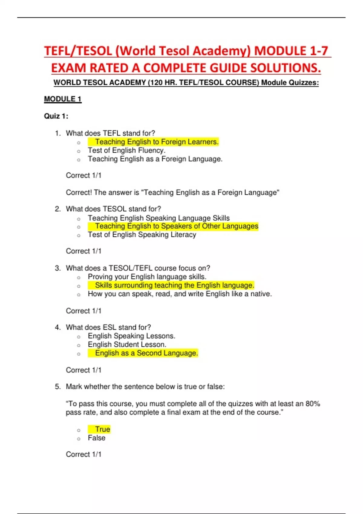TEFL/TESOL (World Tesol Academy) MODULE 1-7 EXAM RATED A COMPLETE GUIDE SOLUTIONS.