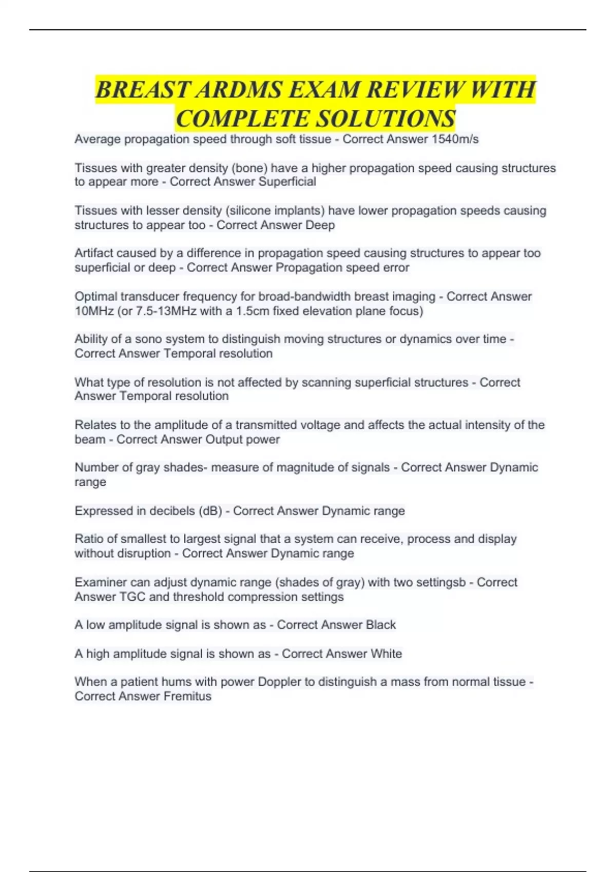 Average propagation speed through soft tissue - Correct Answer 1540m/s Tissues with greater density (bone) have a higher propagation speed causing structures to appear more - Correct Answer Superficial Tissues with lesser density (silicone implants) have lower propagation speeds causing structures to appear too - Correct Answer Deep Artifact caused by a difference in propagation speed causing structures to appear too superficial or deep - Correct Answer Propagation speed error Optimal transducer frequency for broad-bandwidth breast imaging - Correct Answer 10MHz (or 7.5-13MHz with a 1.5cm fixed elevation plane focus) Ability of a sono system to distinguish moving structures or dynamics over time - Correct Answer Temporal resolution What type of resolution is not affected by scanning superficial structures - Correct Answer Temporal resolution Relates to the amplitude of a transmitted voltage and affects the actual intensity of the beam - Correct Answer Output power Number of gray shades- measure of magnitude of signals - Correct Answer Dynamic range Expressed in decibels (dB) - Correct Answer Dynamic range Ratio of smallest to largest signal that a system can receive, process and display without disruption - Correct Answer Dynamic range Examiner can adjust dynamic range (shades of gray) with two settingsb - Correct Answer TGC and threshold compression settings A low amplitude signal is shown as - Correct Answer Black A high amplitude signal is shown as - Correct Answer White When a patient hums with power Doppler to distinguish a mass from normal tissue - Correct Answer Fremitus