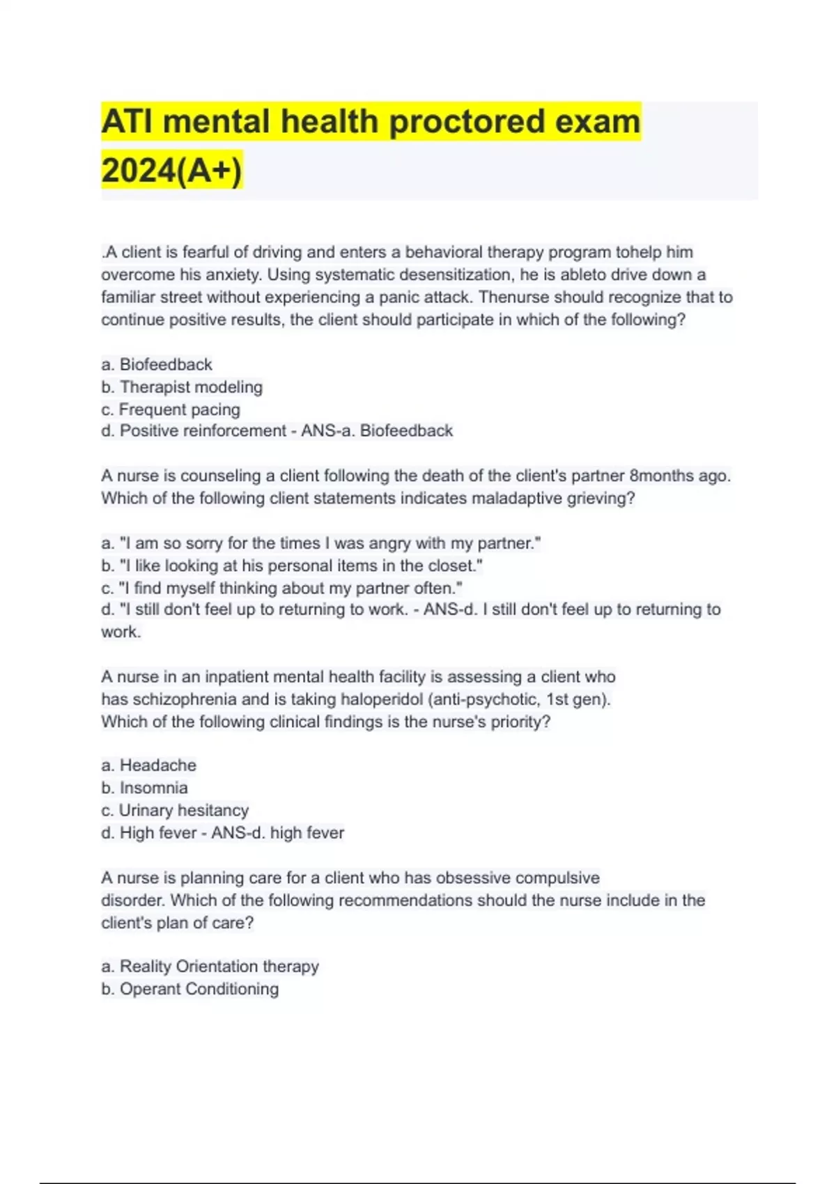 A nurse is counseling a client following the death of the client's partner 8months ago. Which of the following client statements indicates maladaptive grieving? a. "I am so sorry for the times I was angry with my partner." b. "I like looking at his personal items in the closet." c. "I find myself thinking about my partner often." d. "I still don't feel up to returning to work. - ANS-d. I still don't feel up to returning to work.