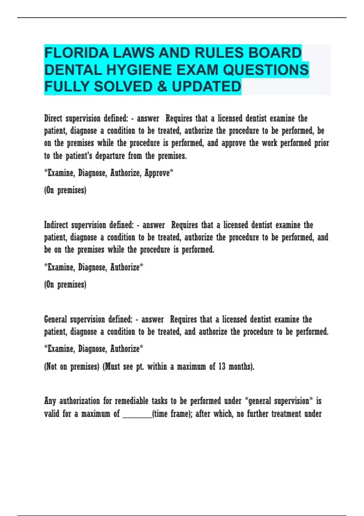 FLORIDA LAWS AND RULES BOARD DENTAL HYGIENE EXAM QUESTIONS FULLY SOLVED