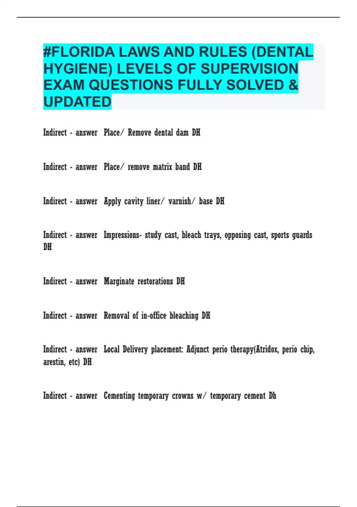 #FLORIDA LAWS AND RULES (DENTAL HYGIENE) LEVELS OF SUPERVISION EXAM QUESTIONS AND ANSWERS