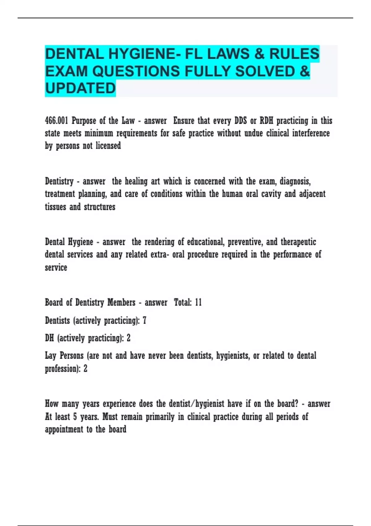 DENTAL HYGIENE- FL LAWS & RULES EXAM QUESTIONS FULLY SOLVED & UPDATED