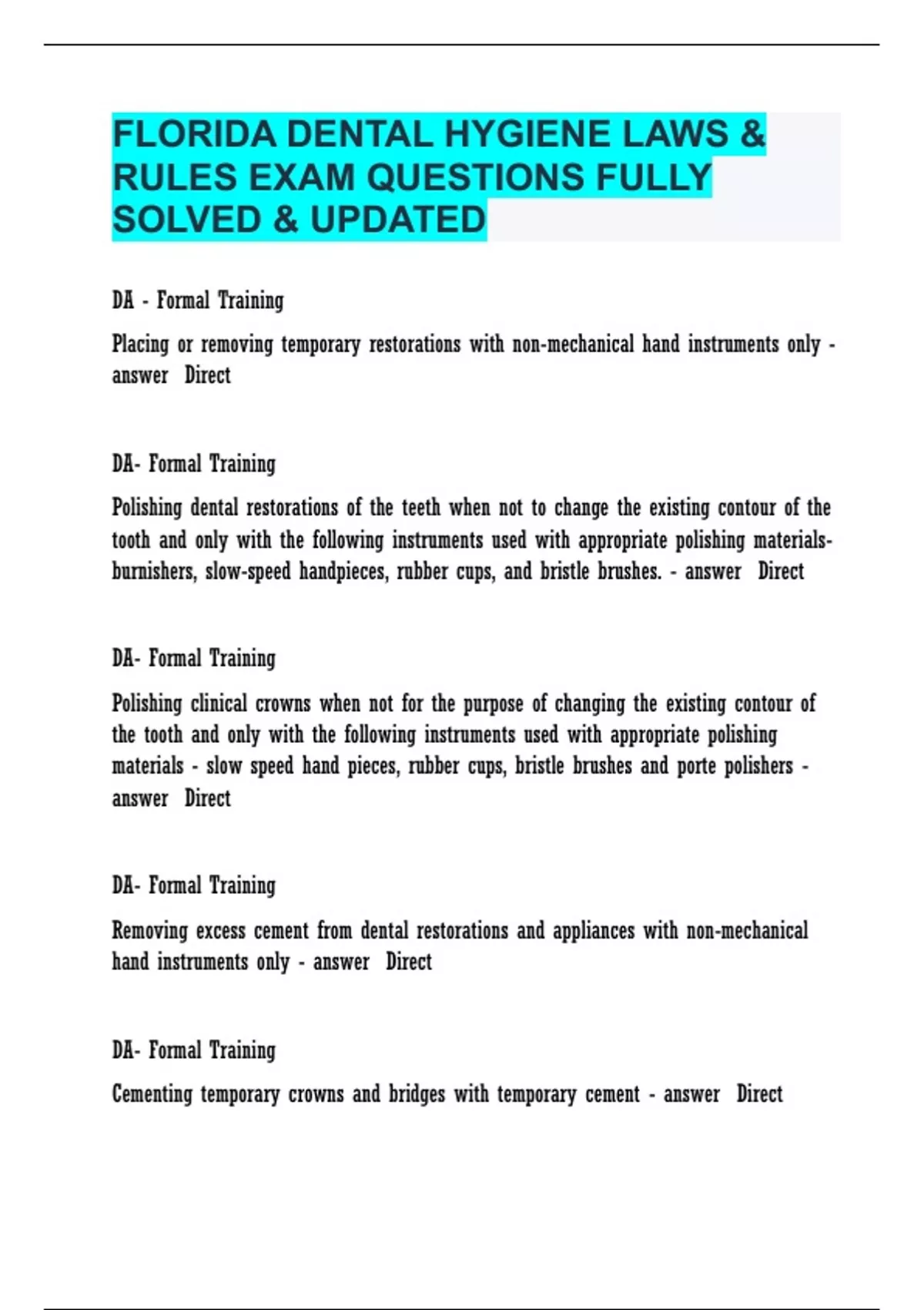FLORIDA DENTAL HYGIENE LAWS & RULES EXAM QUESTIONS AND ANSWERS