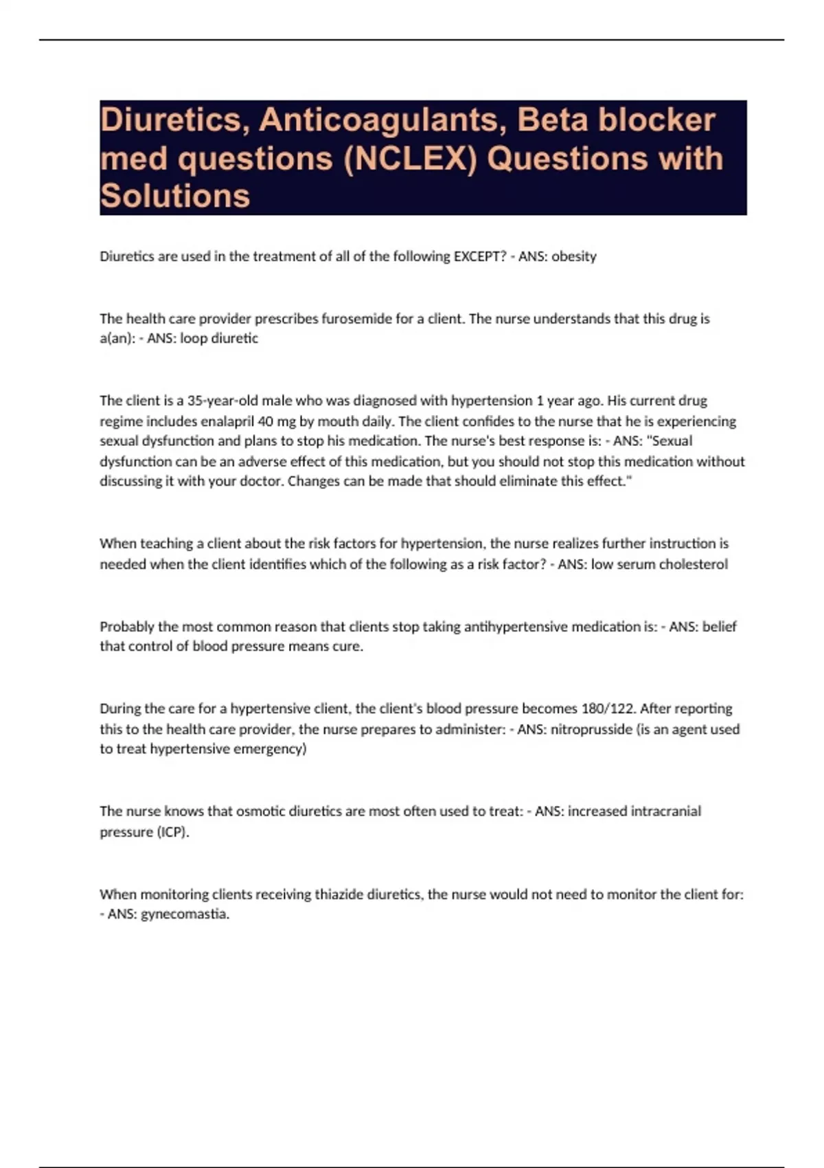 Diuretics, Anticoagulants, Beta blocker med questions (NCLEX) Questions with Solutions