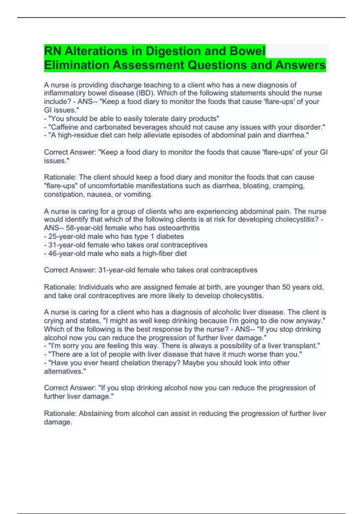 RN Alterations in Digestion and Bowel Elimination Assessment Questions and Answers