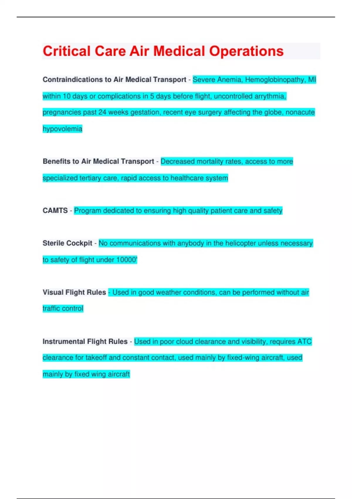 Critical Care Air Medical Operations Exam Questions and Answers || Latest Version 2024