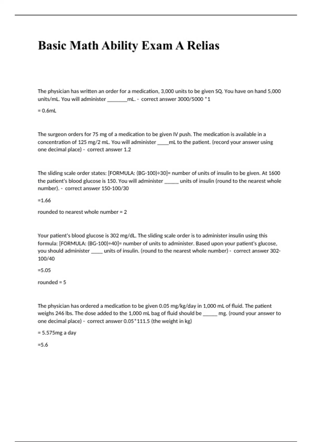 Basic Math Ability Exam A Relias The physician has written an order for a medication, 3,000 units to be given SQ. You have on hand 5,000 units/mL. You will administer _______mL. - correct answer 3000/5000 *1 = 0.6mL The surgeon orders for 75 mg of a medication to be given IV push. The medication is available in a concentration of 125 mg/2 mL. You will administer ____mL to the patient. (record your answer using one decimal place) - correct answer 1.2 The sliding scale order states: [FORMULA: (BG-100)÷30]= number of units of insulin to be given. At 1600 the patient's blood glucose is 150. You will administer _____ units of insulin (round to the nearest whole number). - correct answer 150-100/30 =1.66 rounded to nearest whole number = 2 Your patient's blood glucose is 302 mg/dL. The sliding scale order is to administer insulin using this formula: [FORMULA: (BG-100)÷40]= number of units to administer. Based upon your patient's glucose, you should administer ____ units of insulin. (round to the nearest whole number) - correct answer 302-100/40 =5.05 rounded = 5 The physician has ordered a medication to be given 0.05 mg/kg/day in 1,000 mL of fluid. The patient weighs 246 lbs. The dose added to the 1,000 mL bag of fluid should be _____ mg. (round your answer to one decimal place) - correct answer 0.05*111.5 (the weight in kg) = 5.575mg a day =5.6