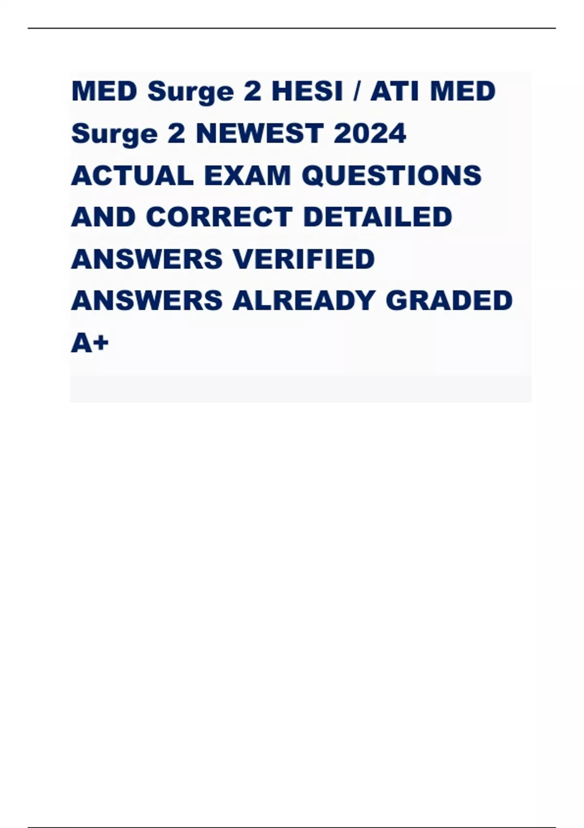 MED Surge 2 HESI/ ATI MED Surge 2 NEWEST 2024 ACTUAL EXAMQUESTIONS AND CORRECT DETAILED ANSWERS VERIFIED ANSWERSALREADY GRADED A+