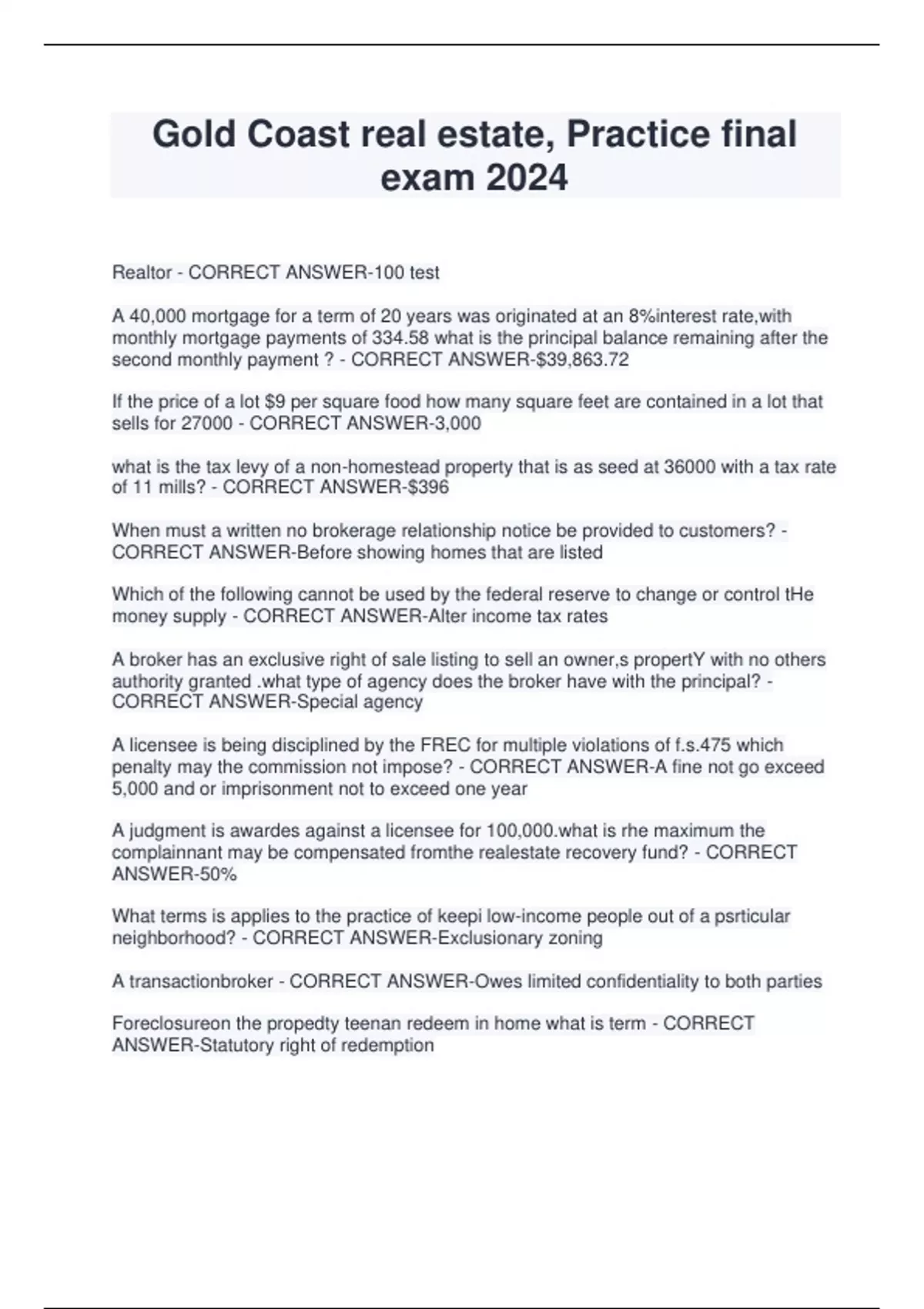 Gold Coast real estate, Practice final exam 2024 Realtor - CORRECT ANSWER-100 test A 40,000 mortgage for a term of 20 years was originated at an 8%interest rate,with monthly mortgage payments of 334.58 what is the principal balance remaining after the second monthly payment ? - CORRECT ANSWER-$39,863.72 If the price of a lot $9 per square food how many square feet are contained in a lot that sells for 27000 - CORRECT ANSWER-3,000 what is the tax levy of a non-homestead property that is as seed at 36000 with a tax rate of 11 mills? - CORRECT ANSWER-$396 When must a written no brokerage relationship notice be provided to customers? - CORRECT ANSWER-Before showing homes that are listed Which of the following cannot be used by the federal reserve to change or control tHe money supply - CORRECT ANSWER-Alter income tax rates A broker has an exclusive right of sale listing to sell an ow