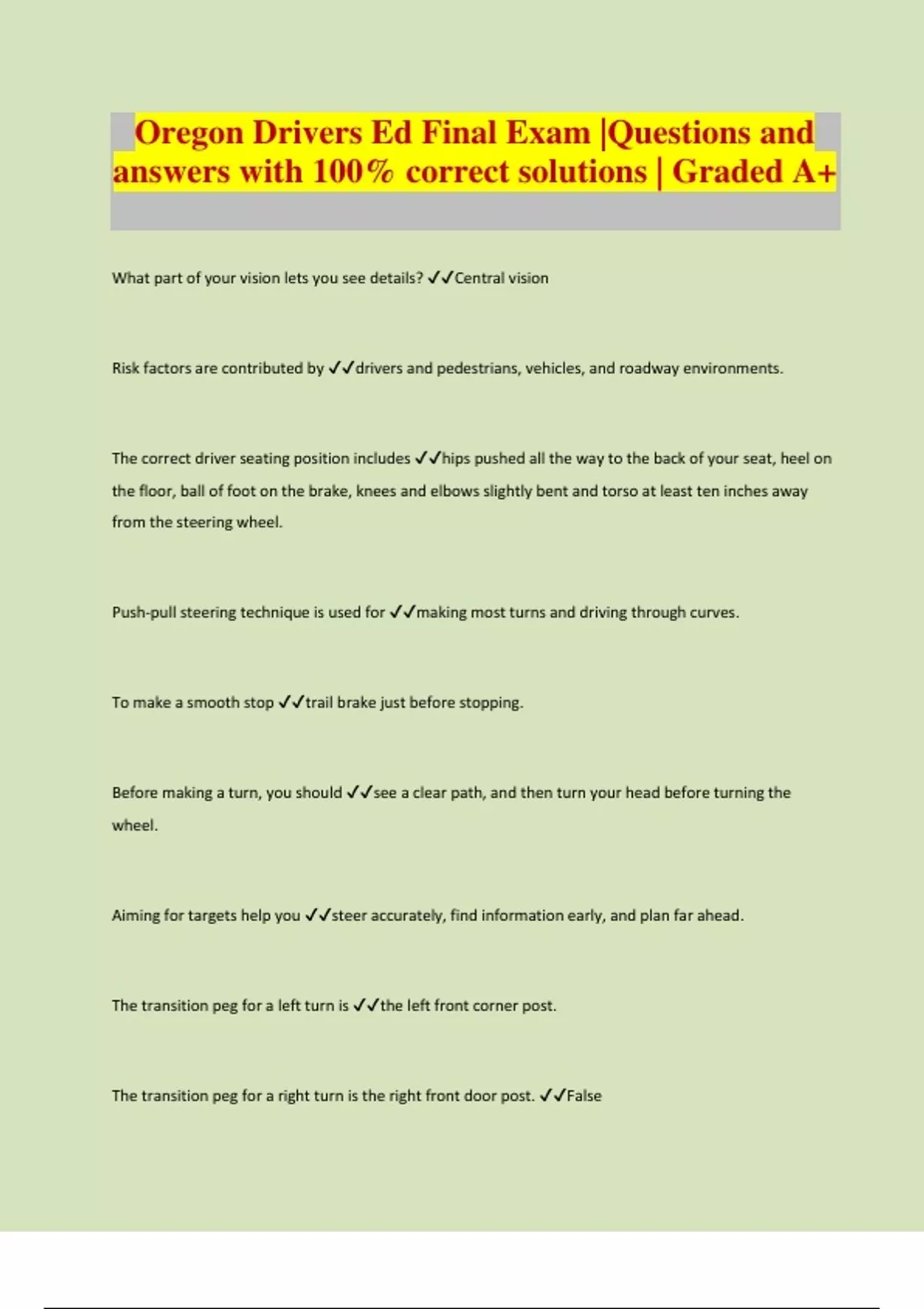 Oregon Drivers Ed Final Exam |Questions and answers with 100% correct solutions | Graded A+