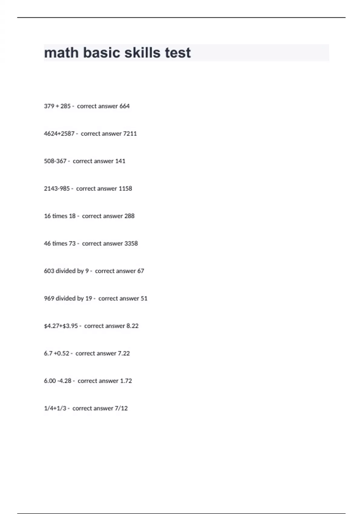 math basic skills test 379 + 285 - correct answer 664 4624+2587 - correct answer 7211 508-367 - correct answer 141 2143-985 - correct answer 1158 16 times 18 - correct answer 288 46 times 73 - correct answer 3358 603 divided by 9 - correct answer 67 969 divided by 19 - correct answer 51 $4.27+$3.95 - correct answer 8.22 6.7 +0.52 - correct answer 7.22 6.00 -4.28 - correct answer 1.72 1/4+1/3 - correct answer 7/12