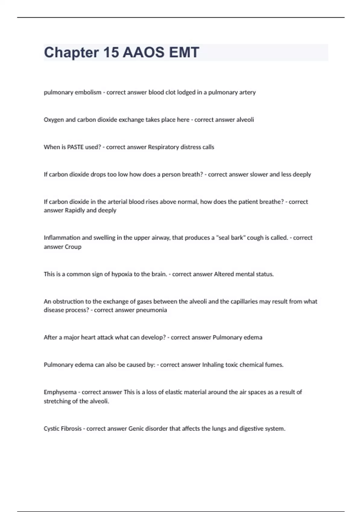 Chapter 15 AAOS EMT STUDY GUIDE EXAM QUESTIONS 2024. pulmonary embolism - correct answer blood clot lodged in a pulmonary artery Oxygen and carbon dioxide exchange takes place here - correct answer alveoli When is PASTE used? - correct answer Respiratory distress calls If carbon dioxide drops too low how does a person breath? - correct answer slower and less deeply If carbon dioxide in the arterial blood rises above normal, how does the patient breathe? - correct answer Rapidly and deeply Inflammation and swelling in the upper airway, that produces a "seal bark" cough is called. - correct answer Croup This is a common sign of hypoxia to the brain. - correct answer Altered mental status. An obstruction to the exchange of gases between the alveoli and the capillaries may result from what disease process? - correct answer pneumonia After a major heart attack what can develop? - correct answer Pulmonary edema Pulmonary edema can also be caused by: - correct answer Inhaling toxic chemical fumes. Emphysema - correct answer This is a loss of elastic material around the air spaces as a result of stretching of the alveoli. Cystic Fibrosis - correct answer Genic disorder that affects the lungs and digestive system.