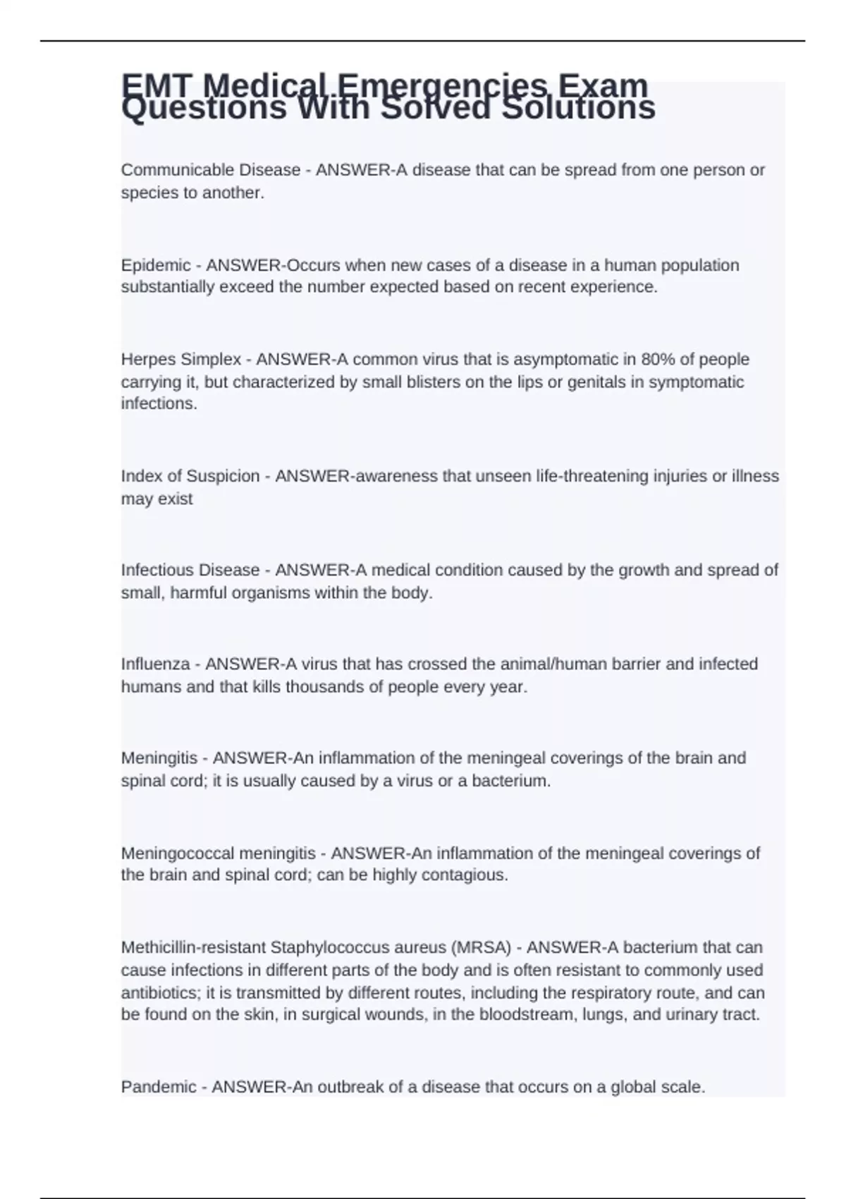 Communicable Disease - ANSWER-A disease that can be spread from one person or species to another. Epidemic - ANSWER-Occurs when new cases of a disease in a human population substantially exceed the number expected based on recent experience. Herpes Simplex - ANSWER-A common virus that is asymptomatic in 80% of people carrying it, but characterized by small blisters on the lips or genitals in symptomatic infections. Index of Suspicion - ANSWER-awareness that unseen life-threatening injuries or illness may exist Infectious Disease - ANSWER-A medical condition caused by the growth and spread of small, harmful organisms within the body. Influenza - ANSWER-A virus that has crossed the animal/human barrier and infected humans and that kills thousands of people every year. Meningitis - ANSWER-An inflammation of the meningeal coverings of the brain and spinal cord; it is usually caused by a virus or a bacterium. Meningococcal meningitis - ANSWER-An inflammation of the meningeal coverings of the brain and spinal cord; can be highly contagious. Methicillin-resistant Staphylococcus aureus (MRSA) - ANSWER-A bacterium that can cause infections in different parts of the body and is often resistant to commonly used antibiotics; it is transmitted by different routes, including the respiratory route, and can be found on the skin, in surgical wounds, in the bloodstream, lungs, and urinary tract.