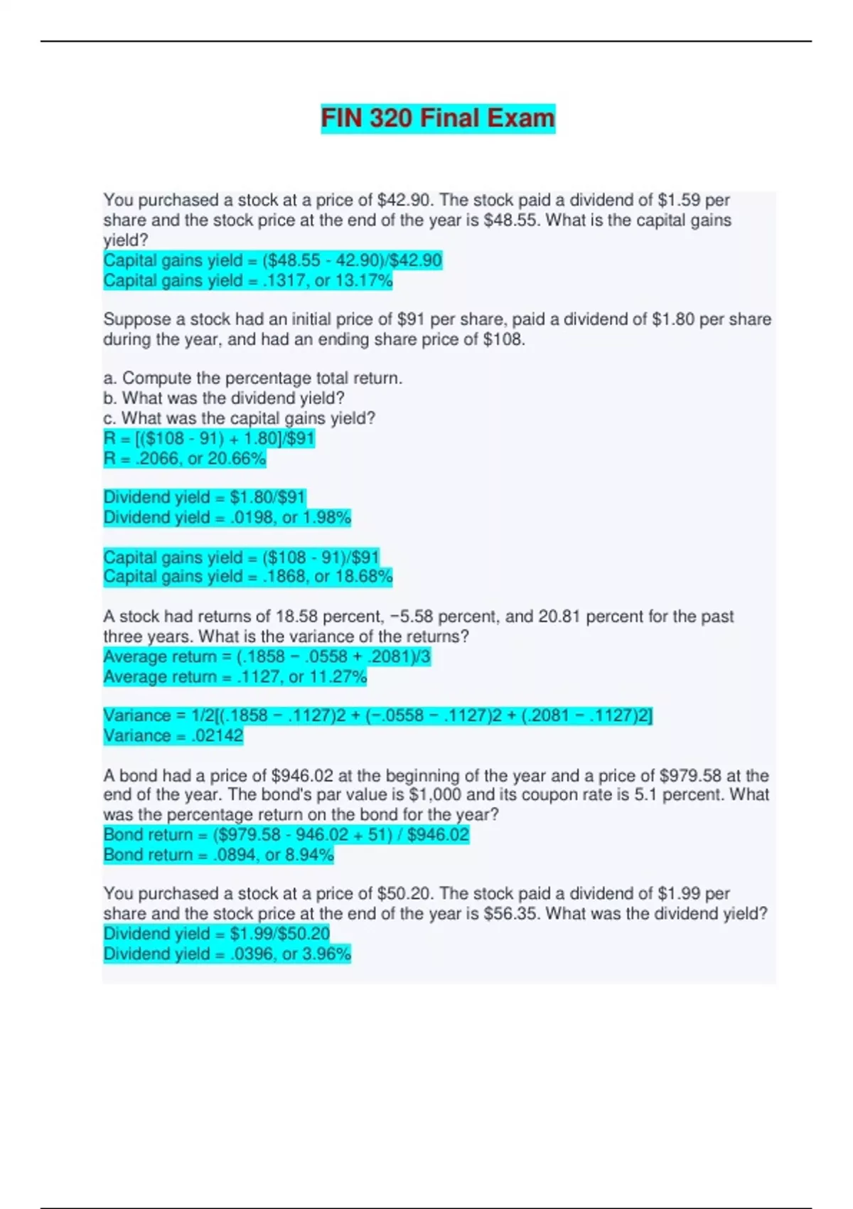 FIN 320 Final Exam - Questions with 100% Correct Answers You purchased a stock at a price of $42.90. The stock paid a dividend of $1.59 per share and the stock price at the end of the year is $48.55. What is the capital gains yield? Capital gains yield = ($48.55 - 42.90)/$42.90 Capital gains yield = .1317, or 13.17% Suppose a stock had an initial price of $91 per share, paid a dividend of $1.80 per share during the year, and had an ending share price of $108. a. Compute the percentage total return. b. What was the dividend yield? c. What was the capital gains yield? R = [($108 - 91) + 1.80]/$91 R = .2066, or 20.66% Dividend yield = $1.80/$91 Dividend yield = .0198, or 1.98% Capital gains yield = ($108 - 91)/$91 Capital gains yield = .1868, or 18.68% A stock had returns of 18.58 percent, −5.58 percent, and 20.81 percent for the past three years. What is the variance of the returns? Average return = (.1858 − .0558 + .2081)/3 Average return = .1127, or 11.27% Variance = 1/2[(.1858 − .1127)2 + (−.0558 − .1127)2 + (.2081 − .1127)2] Variance = .02142 A bond had a price of $946.02 at the beginning of the year and a price of $979.58 at the end of the year. The bond's par value is $1,000 and its coupon rate is 5.1 percent. What was the percentage return on the bond for the year? Bond return = ($979.58 - 946.02 + 51) / $946.02 Bond return = .0894, or 8.94% You purchased a stock at a price of $50.20. The stock paid a dividend of $1.99 per share and the stock price at the end of the year is $56.35. What was the dividend yield? Dividend yield = $1.99/$50.20 Dividend yield = .0396, or 3.96% You purchased GARP stock one year ago at a price of $66.51 per share. Today, you sold your stock and earned a total return of 18.63 percent. The stock paid dividends of $2.76 per share over the year. What was the capital gains yield on your investment? Dividend yield = $2.76/$66.51 Dividend yield = .0415, or 4.15% Capital gains yield = 18.63% - 4.15% Capital gains yield = 14.48% Last year, you purchased 510 shares of Forever, Inc., stock at a price of $45.44 per share. You received $714 in dividends and a total of $25,556 when you sold the stock. What was the capital gains yield on this stock? Capital gains yield = [($25,556/510) − 45.44]/$45.44 Capital gains yield = .1028, or 10.28% You purchased 1,900 shares of Barrett Golf Corp. stock at a price of $37.48 per share. While you owned the stock, you received dividends totaling $.87 per share. Today, you sold your stock at a price of $41.61 per share. What was your total dollar return on the investment? Total dollar return = ($41.61 − 37.48 + .87) × 1,900 Total dollar return = $9,500 You purchased a zero-coupon bond one year ago for $280.83. The market interest rate is now 9 percent. Assume semiannual compounding. If the bond had 15 years to maturity when you originally purchased it, what was your total return for the past year? P1 = $1,000/1.045^28 P1 = $291.57 R = ($291.57 - 280.83)/$280.83 R = .0382, or 3.82% You purchased 330 shares of a particular stock at the beginning of the year at a price of $75.93. The stock paid a dividend of $1.25 per share, and the stock price at the end of the year was $82.44. What was your dollar return on this investment? Dollar return = 330($82.44 - 75.93 + 1.25) Dollar return = $2,560.80 Use the following returns for X and Y X: Year 1 = 22.2%, Year 2 = -17.2, Year 3 = 10.2, Year 4 = 20.4, Year 5 = 5.2 Y: Year 1 = 27.6%, Year 2 = -4.2, Year 3 = 29.6, Year 4 = -15.4, Year 5 = 33.6 a. Calculate the average returns for X and Y. b. Calculate the variances for X and Y. c. Calculate the standard deviations for X and Y. X: (.222 − .172 + .102 + .204 + .052)/5 =.0816, or 8.16% Y: (.276 − .042 + .296 − .154 + .336)/5 =.1424, or 14.24% σx2: (1/5−1){(.222−.0816)^2+(−.172−.0816)^2+(.102−.0816)^2+(.204−.0816)^2+(.052−.0816)^2} =.025075 σy2: (1/5−1){(.276−.1424)^2+(−.042−.1424)^2+(.296−.1424)^2+(−.154−.1424)^2+(.336−.1424)^2} =.050195 σX = .025075^1/2 σX = .1584, or 15.84% σY = .050195^1/2 σY = .2240, or 22.40% You bought a stock three months ago for $83.32 per share. The stock paid no dividends. The current share price is $90.34. What is the APR and EAR of your investment? R = ($90.34 - 83.32)/$83.32 R = .0843, or 8.43% APR = 4(8.43%) APR = 33.70% EAR = (1 + .0843)^4 - 1 EAR = .3820, or 38.20% You've observed the following returns on Yamauchi Corporation's stock over the past five years: -24.9 percent, 13.6 percent, 30.2 percent, 2.3 percent, and 21.3 percent. a. What was the arithmetic average return on the stock over this five-year period? b. What was the variance of the returns over this period? c. What was the standard deviation of the returns over this period? Arithmetic average return = (-.249 + .136 + .302 + .023 + .213)/5 Arithmetic average return = .0850, or 8.50% Variance = 1/4[(-.249 - .0850)^2 + (.136 - .0850)^2 + (.302 - .0850)^2 + (.023 - .0850)^2 + (.213 - .0850)^2] Variance = .045369 Standard deviation = .045369^1/2 Standard deviation = .2130, or 21.30% A stock had returns of 17.75 percent, −11.68 percent, 23.60 percent, and 13.71 percent for the past four years. What is the standard deviation of the returns? Average return = (.1775 − .1168 + .2360 + .1371)/4 Average return = .1085, or 10.85% Variance = 1/3[(.1775 − .1085)^2 + (−.1168 − .1085)^2 + (.2360 − .1085)^2 + (.1371 − .1085)^2] Variance = .02420 Standard deviation = .02420^1/2 Standard deviation = .1556, or 15.56% You purchased 300 shares of stock at a price of $39.12 per share. Over the last year, you have received total dividend income of $330. What is the dividend yield? Dividend yield = ($330/300)/$39.12 Dividend yield = .028, or 2.8% One year ago, you purchased a stock at a price of $57.45 per share. Today, you sold your stock at a loss of 18.15 percent. Your capital loss was $12.32 per share. What was the dividend yield on this stock? Dividend yield = −.1815 − (−$12.32/$57.45) Dividend yi