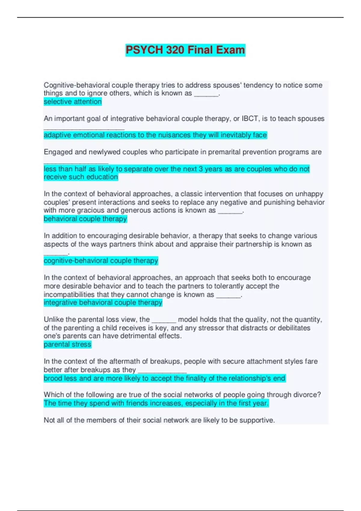 PSYCH 320 Final Exam - Questions and Answers Cognitive-behavioral couple therapy tries to address spouses' tendency to notice some things and to ignore others, which is known as ______. selective attention An important goal of integrative behavioral couple therapy, or IBCT, is to teach spouses ____________________ adaptive emotional reactions to the nuisances they will inevitably face Engaged and newlywed couples who participate in premarital prevention programs are ___________less than half as likely to separate over the next 3 years as are couples who do not receive such education In the context of behavioral approaches, a classic intervention that focuses on unhappy couples' present interactions and seeks to replace any negative and punishing behavior with more gracious and generous actions is known as ______. behavioral couple therapy In addition to encouraging desirable behavior, a therapy that seeks to change various aspects of the ways partners think about and appraise their partnership is known as ______. cognitive-behavioral couple therapy In the context of behavioral approaches, an approach that seeks both to encourage more desirable behavior and to teach the partners to tolerantly accept the incompatibilities that they cannot change is known as ______. integrative behavioral couple therapy Unlike the parental loss view, the ______ model holds that the quality, not the quantity, of the parenting a child receives is key, and any stressor that distracts or debilitates one's parents can have detrimental effects. parental stress In the context of the aftermath of breakups, people with secure attachment styles fare better after breakups as they ____________ brood less and are more likely to accept the finality of the relationship's end Which of the following are true of the social networks of people going through divorce? The time they spend with friends increases, especially in the first year. Not all of the members of their social network are likely to be supportive. True or false: People who are committed to a partnership act in ways that encourage conflict in order to enrich the relationship. False The change in self-definition where people in committed relationships use more plural pronouns, with we, us, and ours replacing I, me, and mine is known as ______. cognitive interdependence A rose-colored perception that helps protect people's happiness by taking the sting out of a partner's occasional missteps is known as ____________ a positive illusion When committed partners tend to think that their relationships are better than most, and the happier they are, the more exceptional they consider their relationships to be, ______ occurs. perceived superiority In the context of cognitive maintenance mechanisms, contented lovers are relatively uninterested and unaware of how well they could be doing in alternative relationships, and this is known as ______. inattention to alternatives People who are committed to a partnership perceive themselves, their partners, and their relationship in ways that help to ______. sustain the partnership Cognitive maintenance mechanisms make people in committed relationships think of themselves as part of a _________ greater whole that includes them and their partners In the context of Dan Canary and Laura Stafford's relational maintenance strategies, the best predictors of how happy a marriage will be are ______. positivity, assurances, and sharing tasks In the context of cognitive maintenance mechanisms, committed partners idealize each other and perceive their relationship in the best possible light, and thus, think of each other with ______. positive illusions