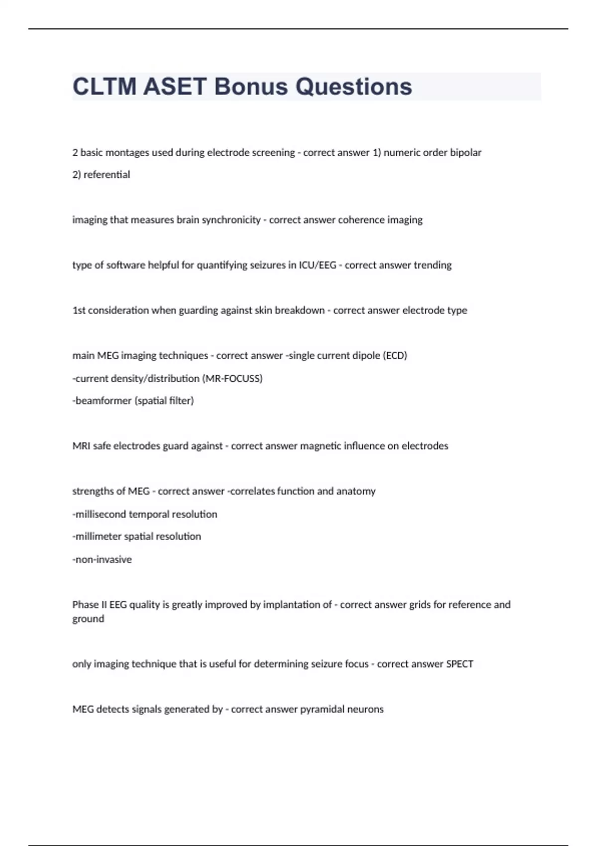 CLTM ASET Bonus Questions Question and answers correctly solved 2024 2 basic montages used during electrode screening - correct answer 1) numeric order bipolar 2) referential imaging that measures brain synchronicity - correct answer coherence imaging type of software helpful for quantifying seizures in ICU/EEG - correct answer trending 1st consideration when guarding against skin breakdown - correct answer electrode type main MEG imaging techniques - correct answer -single current dipole (ECD) -current density/distribution (MR-FOCUSS) -beamformer (spatial filter) MRI safe electrodes guard against - correct answer magnetic influence on electrodes strengths of MEG - correct answer -correlates function and anatomy -millisecond temporal resolution -millimeter spatial resolution -non-invasive Phase II EEG quality is