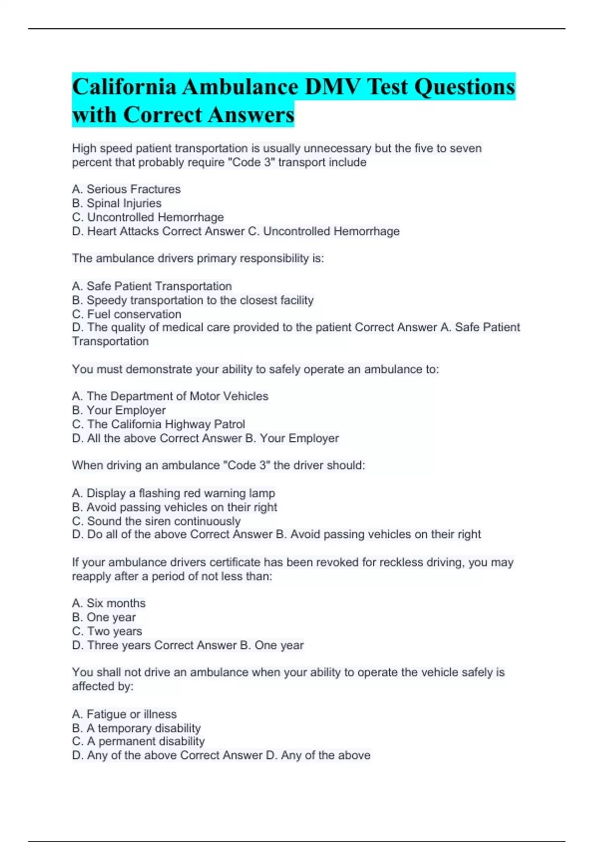 High speed patient transportation is usually unnecessary but the five to seven percent that probably require "Code 3" transport include A. Serious Fractures B. Spinal Injuries C. Uncontrolled Hemorrhage D. Heart Attacks Correct Answer C. Uncontrolled Hemorrhage The ambulance drivers primary responsibility is: A. Safe Patient Transportation B. Speedy transportation to the closest facility C. Fuel conservation D. The quality of medical care provided to the patient Correct Answer A. Safe Patient Transportation You must demonstrate your ability to safely operate an ambulance to: A. The Department of Motor Vehicles B. Your Employer C. The California Highway Patrol D. All the above Correct Answer B. Your Employer When driving an ambulance "Code 3" the driver should: A. Display a flashing red warning lamp B. Avoid passing vehicles on their right C. Sound the siren continuously D. Do all of the above Correct Answer B. Avoid passing vehicles on their right If your ambulance drivers certificate has been revoked for reckless driving, you may reapply after a period of not less than: A. Six months B. One year C. Two years D. Three years Correct Answer B. One year You shall not drive an ambulance when your ability to operate the vehicle safely is affected by: A. Fatigue or illness B. A temporary disability C. A permanent disability D. Any of the above Correct Answer D. Any of the above