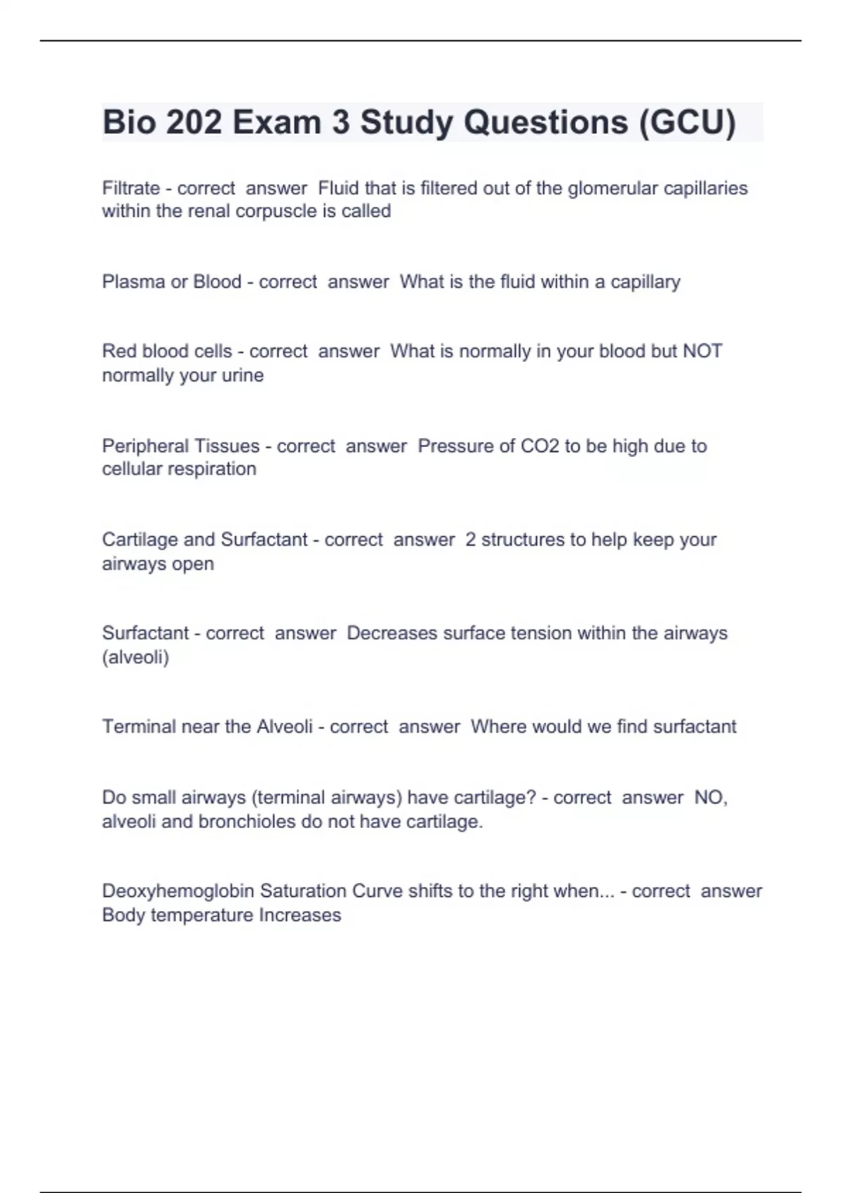 Bio 202 Exam 3 Study Questions and answers already passed 2024 Filtrate - correct answer Fluid that is filtered out of the glomerular capillaries within the renal corpuscle is called Plasma or Blood - correct answer What is the fluid within a capillary Red blood cells - correct answer What is normally in your blood but NOT normally your urine Peripheral Tissues - correct answer Pressure of CO2 to be high due to cellular respiration Cartilage and Surfactant - correct answer 2 structures to help keep your airways open Surfactant - correct answer Decreases surface tension within the airways (alveoli) Terminal near the Alveoli - correct answer Where would we find surfactant Do small airways (terminal airways) have cartilage? - correct answer NO, alveoli and bronchioles do not have cartilage. Deoxyhemoglobin Saturation Curve shifts to the right when... - correct answer Body temperature Increases Saturation Curve s