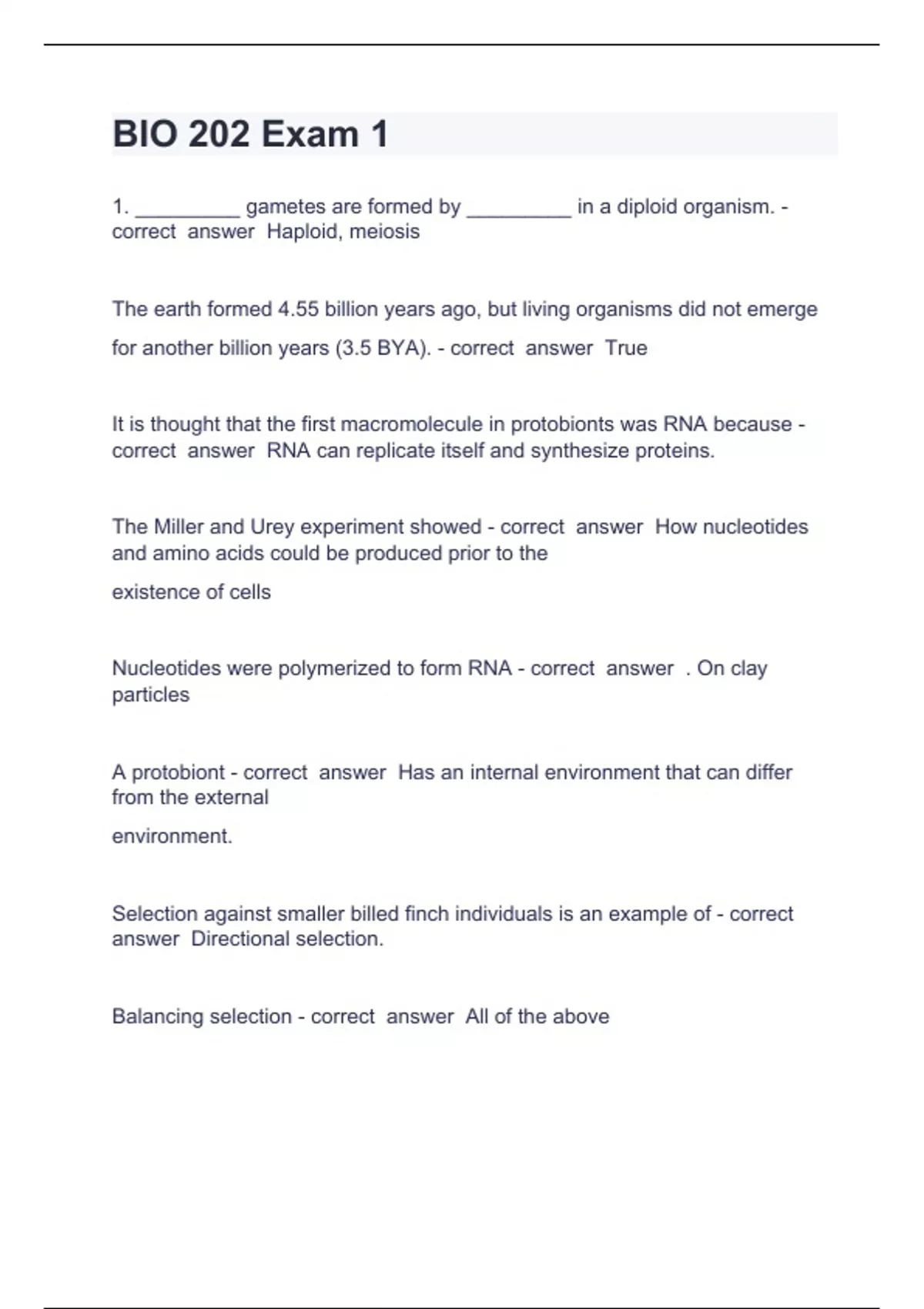BIO 202 Exam 1 Question and answers 2024 verified to pass1. _________ gametes are formed by _________ in a diploid organism. - correct answer Haploid, meiosis The earth formed 4.55 billion years ago, but living organisms did not emerge for another billion years (3.5 BYA). - correct answer True It is thought that the first macromolecule in protobionts was RNA because - correct answer RNA can replicate itself and synthesize proteins. The Miller and Urey experiment showed - correct answer How nucleotides and amino acids could be produced prior to the existence of cells Nucleotides were polymerized to form RNA - correct answer . On clay particles A protobiont - correct answer Has an internal environment that can differ from the external environment.