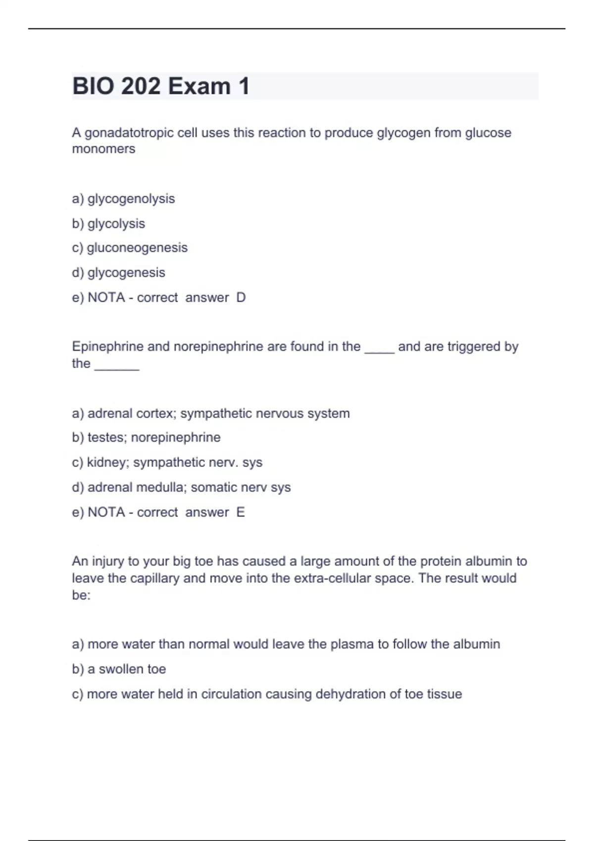 BIO 202 Exam 1 Questions with complete solution 2024 A gonadatotropic cell uses this reaction to produce glycogen from glucose monomers a) glycogenolysis b) glycolysis c) gluconeogenesis d) glycogenesis e) NOTA - correct answer D Epinephrine and norepinephrine are found in the ____ and are triggered by the ______ a) adrenal cortex; sympathetic nervous system b) testes; norepinephrine c) kidney; sympathetic nerv. sys d) adrenal medulla; somatic nerv sys e) NOTA - correct answer E An injury to your big toe has caused a large amount of the protein albumin to leave the capillary and move into the extra-cellular space. The result would be: a) more water than normal would leave the plasma to follow the albumin b) a swollen toe c) more water held