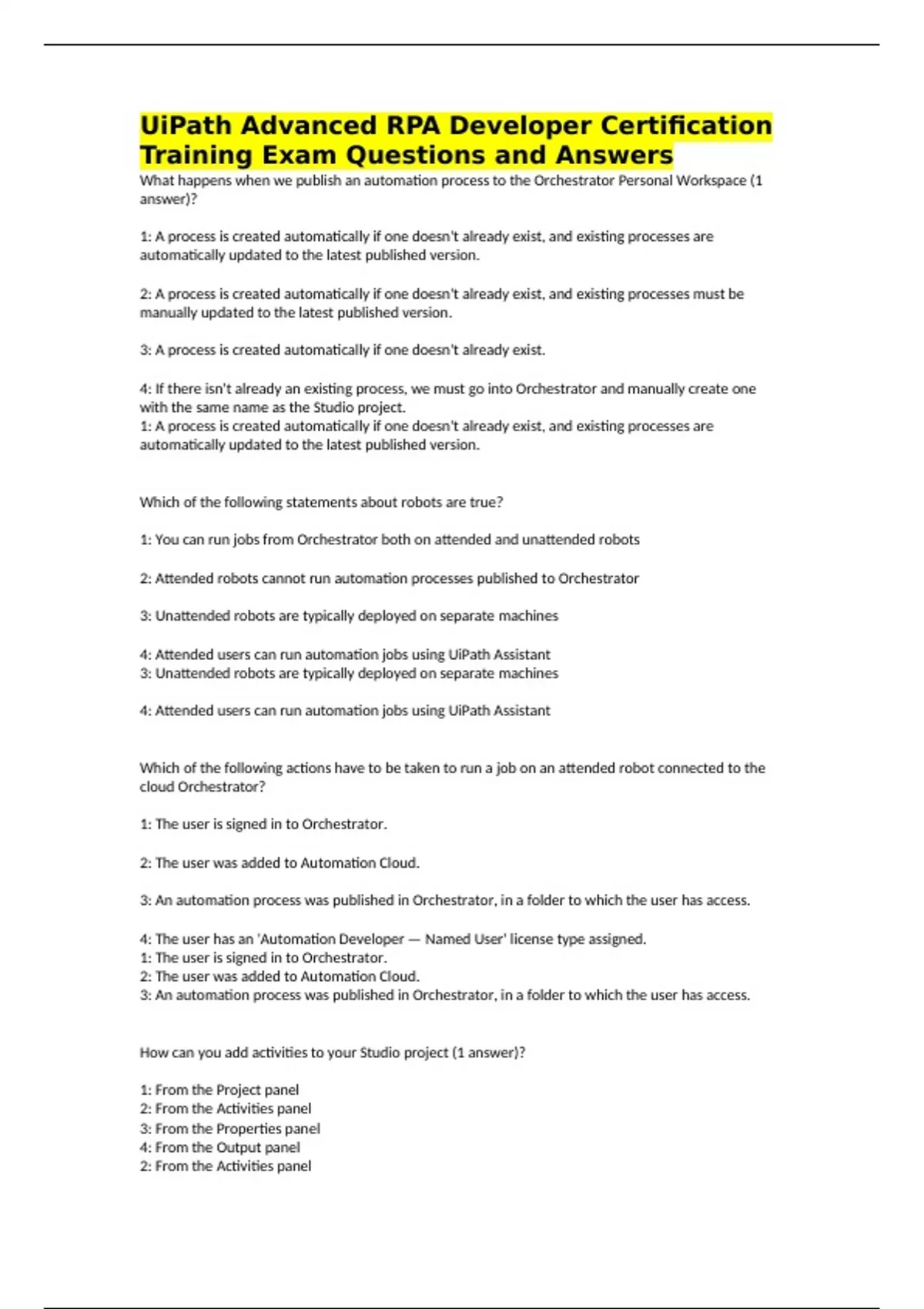 UiPath Advanced RPA Developer Certification Training Exam Questions and Answers What happens when we publish an automation process to the Orchestrator Personal Workspace (1 answer)? 1: A process is created automatically if one doesn't already exist, and existing processes are automatically updated to the latest published version. 2: A process is created automatically if one doesn't already exist, and existing processes must be manually updated to the latest published version. 3: A process is created automatically if one doesn't already exist. 4: If there isn't already an existing process, we must go into Orchestrator and manually create one with the same name as the Studio project. 1: A process is created automatically if one doesn't already exist, and existing processes are automatically updated to the latest published version. Which of the following statements about robots are true? 1: You can run jobs from Orchestrator both on attended and unattended robots 2: Attended robots cannot run automation processes published to Orchestrator 3: Unattended robots are typically deployed on separate machines 4: Attended users can run automation jobs using UiPath Assistant 3: Unattended robots are typically deployed on separate machines 4: Attended users can run automation jobs using UiPath Assistant Which of the following actions have to be taken to run a job on an attended robot connected to the cloud Orchestrator? 1: The user is signed in to Orchestrator. 2: The user was added to Automation Cloud. 3: An automation process was published in Orchestrator, in a folder to which the user has access. 4: The user has an 'Automation Developer — Named User' license type assigned. 1: The user is signed in to Orchestrator. 2: The user was added to Automation Cloud. 3: An automation process was published in Orchestrator, in a folder to which the user has access. How can you add activities to your Studio project (1 answer)? 1: From the Project panel 2: From the Activities panel 3: From the Properties panel 4: From the Output panel 2: From the Activities panel
