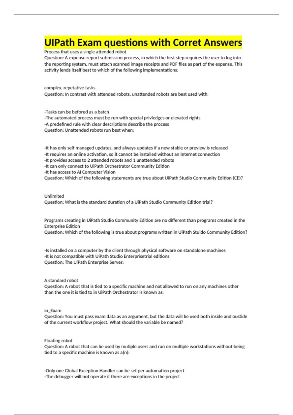 UIPath Exam questions with Corret Answers Process that uses a single attended robot Question: A expense report submission process, in which the first step requires the user to log into the reporting system, must attach scanned image receipts and PDF files as part of the expense. This activity lends itself best to which of the following implementations: complex, repetative tasks Question: In contrast with attended robots, unattended robots are best used with: -Tasks can be befored as a batch -The automated process must be run with special privledges or elevated rights -A predefined rule with clear descriptions describe the process Question: Unattended robots run best when: -It has only self managed updates, and always updates if a new stable or preview is released -It requires an online activation, so it cannot be installed without an Internet connection -It provides access to 2 attended robots and 1 unattended robots -It can only connect to UiPath Orchestrator Community Edition -It has access to AI Computer Vision Question: Which of the following statements are true about UiPath Studio Community Edition (CE)? Unlimited Question: What is the standard duration of a UiPath Studio Community Edition trial? Programs creating in UiPath Studio Community Edition are no different than programs created in the Enterprise Edition Question: Which of the following is true about programs written in UiPath Stuido Community Edition? -Is installed on a computer by the client through physical software on standalone machines -It is not compatible with UiPath Studio Enterprisetrial editions Question: The UiPath Enterprise Server: A standard robot Question: A robot that is tied to a specific machine and not allowed to run on any machines other than the one it is tied to in UiPath Orchestrator is known as: io_Exam Question: You must pass exam data as an argument, but the data will be used both inside and oustide of the current workflow project. What should the variable be named? Floating robot Question: A robot that can be used by mutiple users and run on multiple workstations without being tied to a specific machine is known as a(n): -Only one Global Exception Handler can be set per automation project