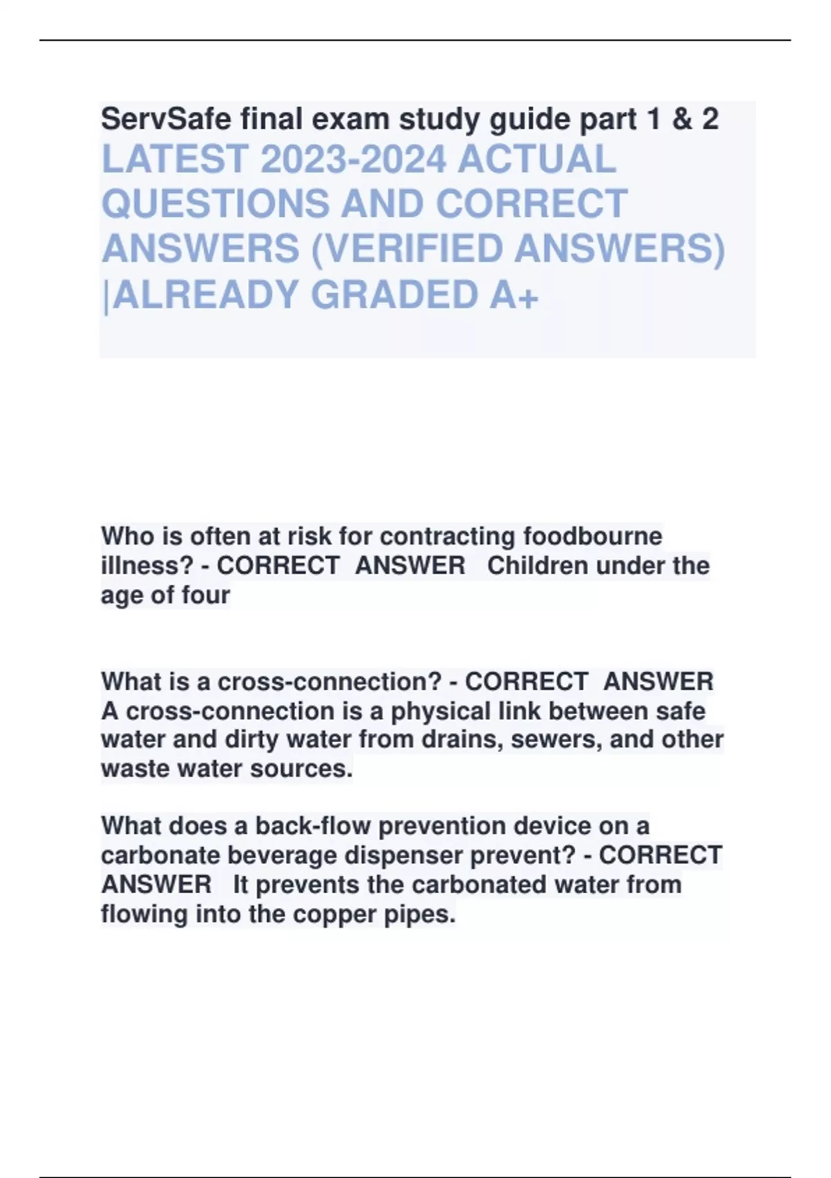 ServSafe final exam study guide part 1 & 2 LATEST ACTUAL QUESTIONS AND CORRECT ANSWERS (VERIFIED ANSWERS) |ALREADY GRADED A+ Who is often at risk for contracting foodbourne illness? - CORRECT ANSWER Children under the age of four What is a cross-connection? - CORRECT ANSWER A cross-connection is a physical link between safe water and dirty water from drains, sewers, and other waste water sources. What does a back-flow prevention device on a carbonate beverage dispenser prevent? - CORRECT ANSWER It prevents the carbonated water from flowing into the copper pipes. What is the appropriate concentration for an iodine sanitizer? - CORRECT ANSWER 12.5-25ppm How long must operations keep shell stock identification tags on file after the date the last shellfish was sold or served? - CORRECT ANSWER You have to keep it in on file for 90 days. Which federal agency issues the model food code? - CORRECT ANSWER The FDA The effectiveness of a chemical sanitizer can be limited by what? - CORRECT ANSWER Detergent being left on the counter top. Who is often at risk for contracting foodbourne illness? - CORRECT ANSWER Children under the age of four What is a cross-connection? - CORRECT ANSWER A cross-connection is a physical link between safe water and dirty water from drains, sewers, and other waste water sources. What does a back-flow prevention device on a carbonate beverage dispenser prevent? - CORRECT ANSWER It prevents the carbonated water from flowing into the copper pipes. What is the appropriate concentration for an iodine sanitizer? - CORRECT ANSWER 12.5-25ppm How long must operations keep shell stock identification tags on file after the date the last shellfish was sold or served? - CORRECT ANSWER You have to keep it in on file for 90 days. Which federal agency issues the model food code? - CORRECT ANSWER The FDA The effectiveness of a chemical sanitizer can be limited by what? - CORRECT ANSWER Detergent being left on the counter top.