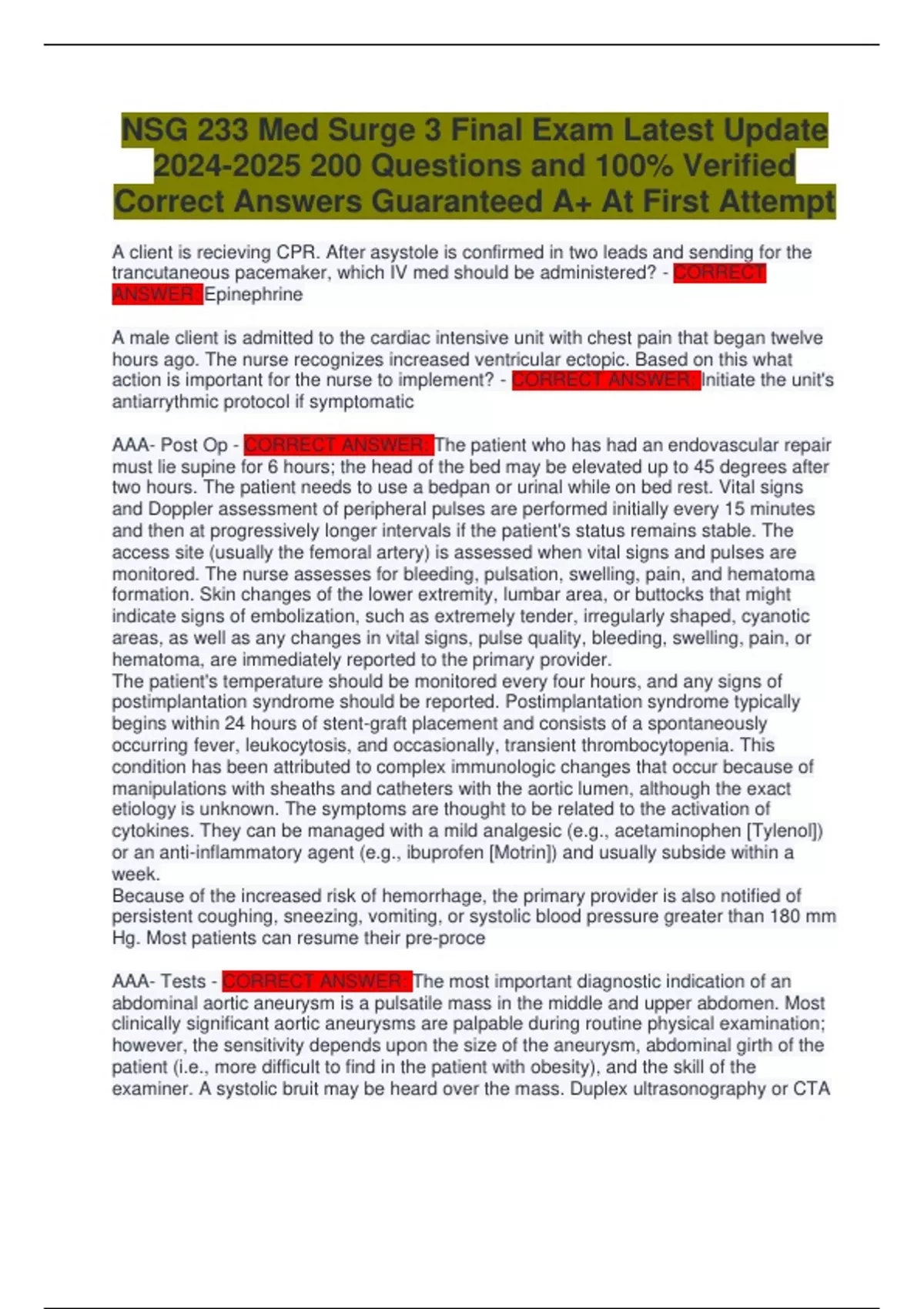 NSG 233 Med Surge 3 Final Exam Latest Update Questions and 100% Verified Correct Answers Guaranteed A+ At First Attempt