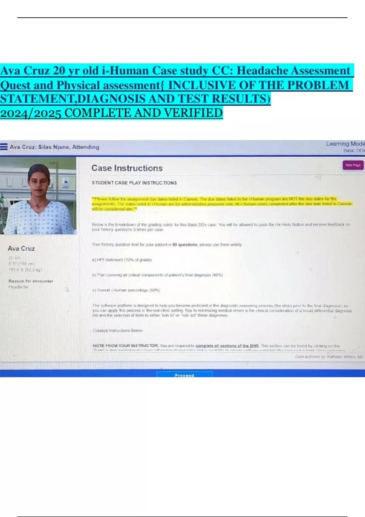 Ava Cruz 20 yr old i-Human Case study CC: Headache Assessment Quest and Physical assessment{ INCLUSIVE OF THE PROBLEM STATEMENT,DIAGNOSIS AND TEST RESULTS) 2024/2025 COMPLETE AND VERIFIED