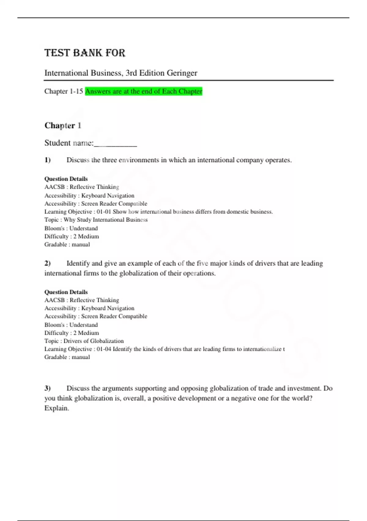Test Bank For International Business, 3rd Edition by Michael Geringer, Jeanne McNett, All Chapter 1-15.