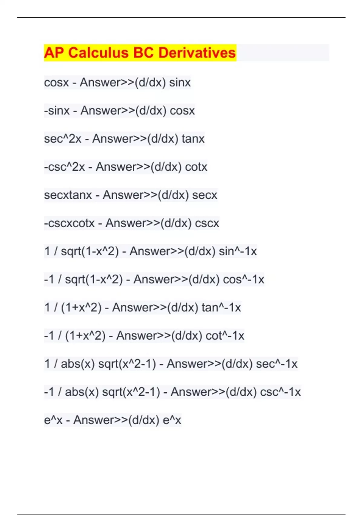 AP Calculus BC Derivatives cosx - Answer(d/dx) sinx -sinx - Answer(d/dx) cosx sec^2x - Answer(d/dx) tanx -csc^2x - Answer(d/dx) cotx secxtanx - Answer(d/dx) secx -cscxcotx - Answer(d/dx) cscx 1 / sqrt(1-x^2) - Answer(d/dx) sin^-1x -1 / sqrt(1-x^2) - Answer(d/dx) cos^-1x
