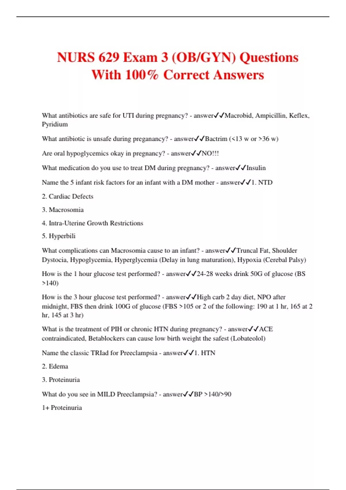 NURS 629 Exam 3 (OB/GYN) Questions With 100% Correct Answers What antibiotics are safe for UTI during pregnancy? - answerMacrobid, Ampicillin, Keflex, Pyridium What antibiotic is unsafe during preganancy? - answerBactrim (<13 w or >36 w) Are oral hypoglycemics okay in pregnancy? - answerNO!!! What medication do you use to treat DM during pregnancy? - answerInsulin Name the 5 infant risk factors for an infant with a DM mother - answer1. NTD 2. Cardiac Defects 3. Macrosomia 4. Intra-Uterine Growth Restrictions 5. Hyperbili What complications can Macrosomia cause to an infant? - answerTruncal Fat, Shoulder Dystocia, Hypoglycemia, Hyperglycemia (Delay in lung maturation), Hypoxia (Cerebal Palsy) How is the 1 hour glucose test performed? - answer24-28 weeks drink 50G of glucose (BS >140) How is the 3 hour glucose test performed? - answerHigh carb 2 day diet, NPO after midnight, FBS then drink 100G of glucose (FBS >105 or 2 of the following: 190 at 1 hr, 165 at 2 hr, 145 at 3 hr) What is the treatment of PIH or chronic HTN during pregnancy? - answerACE contraindicated, Betablockers can cause low birth weight the safest (Lobateolol) Name the classic TRIad for Preeclampsia - answer1. HTN 2. Edema 3. Proteinuria What do you see in MILD Preeclampsia? - answerBP >140/>90 1+ Proteinuria No HA How do you treat MILD Preeclampsia? - answerIncrease protein, document fetal activity, weekly NST What do you see in SEVERE Preeclampsia? - answerBP >160/>110 3+ Proteinuria HA Decreased output Visual disturbances Thrombocytopenia How do you treat SEVERE Preeclampsia? - answerDeliver the baby, rest, decrease stimuli, mag sulfate, medications (Apresoline) What are visual signs and symptoms of Eclampsia? - answerFacial twitching, tonic clonic seizures, pulmonary edema, circulatory/renal failure What are signs and symptoms of HELLP syndrome? - answerRUQ pain, N/V, edema, increased liver enzymes, decreased H&H & platelets What is the treatment of HELLP and Eclampsia? - answerDeliver the baby, bed rest, mag sulfate (Valium or Phenobarb if mg is not effective after 2 hrs), Steriods (Fetal lung maturity), Hydralazine (SEVERE) What is the treatment of Hyperemesis Gravidarum? - answerIV fluids, tpn, antiemetics (B6, unisom, antihestamines), diet as tolerated What education do you need to give about quad screening? - answerIt is not a diagnostic. It is an assessment tool and will be referred to a specialist if positive. What can early bleeding indicate? - answerMiscarriage, ectopic pregnancy, incompetent cervix Explain the 3 types of spontaneous abortions - answer1. Threatened - Vaginal bleeding occurs 2. Inevitable - Membranes rupture and cervix dilates 3. Incomplete - Some products of conception have remained How do you manage a THREATENED abortion? - answerCheck fetus by ultrasound, bed rest, no sex for 2 weeks after bleeding stops, no false reassurance of outcome