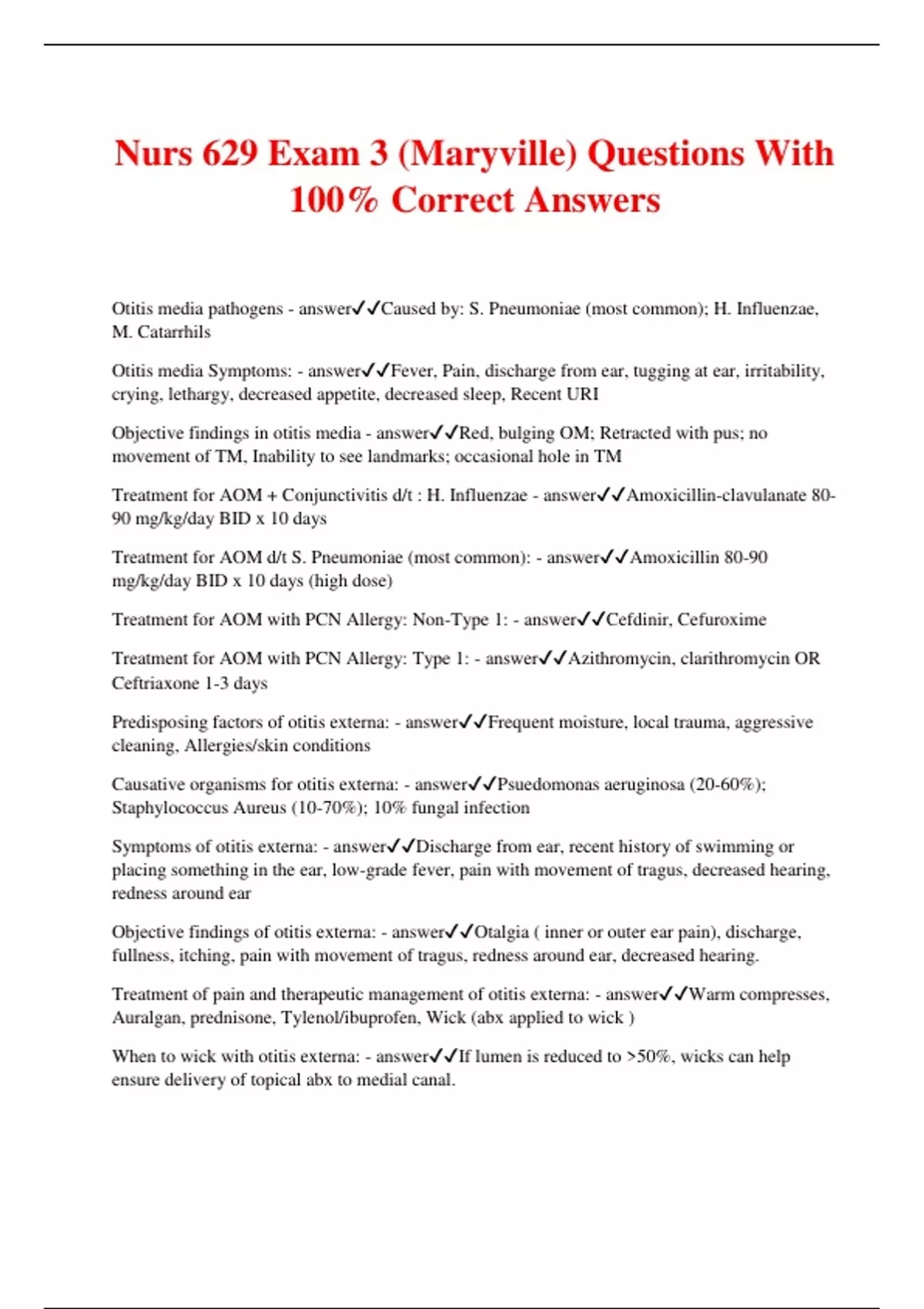 Nurs 629 Exam 3 (Maryville) Questions With 100% Correct Answers Otitis media pathogens - answerCaused by: S. Pneumoniae (most common); H. Influenzae, M. Catarrhils Otitis media Symptoms: - answerFever, Pain, discharge from ear, tugging at ear, irritability, crying, lethargy, decreased appetite, decreased sleep, Recent URI Objective findings in otitis media - answerRed, bulging OM; Retracted with pus; no movement of TM, Inability to see landmarks; occasional hole in TM Treatment for AOM + Conjunctivitis d/t : H. Influenzae - answerAmoxicillin-clavulanate 80- 90 mg/kg/day BID x 10 days Treatment for AOM d/t S. Pneumoniae (most common): - answerAmoxicillin 80-90 mg/kg/day BID x 10 days (high dose) Treatment for AOM with PCN Allergy: Non-Type 1: - answerCefdinir, Cefuroxime Treatment for AOM with PCN Allergy: Type 1: - answerAzithromycin, clarithromycin OR Ceftriaxone 1-3 days Predisposing factors of otitis externa: - answerFrequent moisture, local trauma, aggressive cleaning, Allergies/skin conditions Causative organisms for otitis externa: - answerPsuedomonas aeruginosa (20-60%); Staphylococcus Aureus (10-70%); 10% fungal infection Symptoms of otitis externa: - answerDischarge from ear, recent history of swimming or placing something in the ear, low-grade fever, pain with movement of tragus, decreased hearing, redness around ear Objective findings of otitis externa: - answerOtalgia ( inner or outer ear pain), discharge, fullness, itching, pain with movement of tragus, redness around ear, decreased hearing. Treatment of pain and therapeutic management of otitis externa: - answerWarm compresses, Auralgan, prednisone, Tylenol/ibuprofen, Wick (abx applied to wick ) When to wick with otitis externa: - answerIf lumen is reduced to >50%, wicks can help ensure delivery of topical abx to medial canal. Treatment of otitis externa: - answerTopical fluroquinolones (Ciprofloxacin, Ofloxacin), ibuprofen and apap for pain, neomycin/polymixin b/hydrocortison otic (antibiotic/steroid) Hallmark sign of otitis externa: - answerTraction of pinna elicits pain When do we begin hearing tests in clinic for children - answer4 years old What is a normal audiology test result and how are results read - answerNormal -10 to +15 The higher the number, the greater the loss, Severe loss 71-90 (learning disability, limited vocabulary), Profound loss 90 Risk factors related to elevated cholesterol - answerObesity, Diabetes, Hypertension, Family history: Coronary heart disease prior to age 55, Hyperlipidemia, Diabetes Clinical findings for tetralogy of Fallot: - answerCyanosis: caused by blood low in oxygen, Shortness of breath and rapid breathing, especially during feeding or exercise, Loss of consciousness, Clubbing of fingers and toes, Poor weight gain, delayed growth, Polycythemia, metabolic acidosis, Systolic murmur at 2nd left ICS & holosystolic murmur at LLSB What criteria would you have to consider inpatient admission in a patient with pneumonia - answerInfants less than 4 months old, Infant with poor feeding, grunting, O2 saturation <92%, respiratory rate >70 , Older child with grunting, inability to tolerate oral intake, oxygen saturation ≤ 92 percent, respiratory rate > 50 breaths per minute, Any age: Comorbidities (e.g., chronic lung disease, asthma, unrepaired or incompletely repaired congenital heart disease, diabetes mellitus, neuromuscular disease) Visual acuity of a 2-month-old - answer• Vision is 20/400 • Fix and follow objects Viral conjunctivitis etiology (causative agent): - answerAdenovirus is the most common cause. Other causes: HSV, herpes zoster, and varicella Viral conjunctivitis symptoms: - answero Watery discharge (profuse and clear), foreign body sensation, redness o URI symptoms are common including sore throat and fever o Itchy conjunctiva and swollen eye lids o Often bilateral Viral conjunctivitis Clinical findings - answero Normal visual acuity, PERRLA, EOMI, Fundus normal o Mucoid-profuse watery discharge o Mild, diffuse injection and itching o *Preauricular lymphadenopathy Viral conjunctivitis Treatment: - answerSymptomatic Only - Warm or cool compresses, Strict hand hygiene Pharyngitis - answerTypically viral Causative organism for bacterial pharyngitis - answerGroup A Beta Hemolytic strep Subjective findings for strep pharyngitis: - answerRapid onset of sore throat, abdominal pain, headache, dysphasiay Objective findings for strep pharyngitis: - answerFever >103, Swollen glands, anorexia, lack of uri s/sx, irritability, Exudative tonsils, scarlatina rash, strawberry tongue, anterior cervical lymphadenopathy Treatment for strep pharyngitis - answerAmoxicillin 5mg/kg/day x10 days If allergy to first line tx for strep pharyngitis, what do you prescribe? - answerCephalosporin or macrolide (azithromycin) Therapeutic tx for strep pharyngitis (in addition to abx) - answerWarm water gargle/apap/ibu Education re strep pharyngitis: - answerDiscard toothbrush after 24hs on an abx and after treatment completion When may pt return to school with strep pharyngitis: - answerThis is contagious. May return to school after 24 hours on abx Scarlet fever: - answerOccurs secondary to strep throat and progresses to acute rheumatic fever if no intervention Is scarlet fever common or rare? - answerRare Subjective/Objective findings of scarlet fever: - answerScarlatina begins on face and spreads down and out/strawberry tongue/Fever/pharyngitis Treatment of scarlet fever: - answeramoxicillin 50-80 mg/kg/day x7 days Classic triad of mononucleosis Pharyngitis: - answerFever, equative pharyngitis POSTERIOR cervical lymphadenopathy Subjective sx of mononucleosis: - answermalaise, fatigue, headache, anorexia, Objective s/sx of mononucleosis: - answerAbnormal LFTs, splenic enlargement, CBC c diff- lymphocytosis c atypical cells, monospot positive, EBV virus specifics - VCA-IgM, VCA AgG, EA, EBNA, negative rapid strep c culture Treatment for mononucleosis: - answerSymptomatic unless severe Treatment for mononucleo