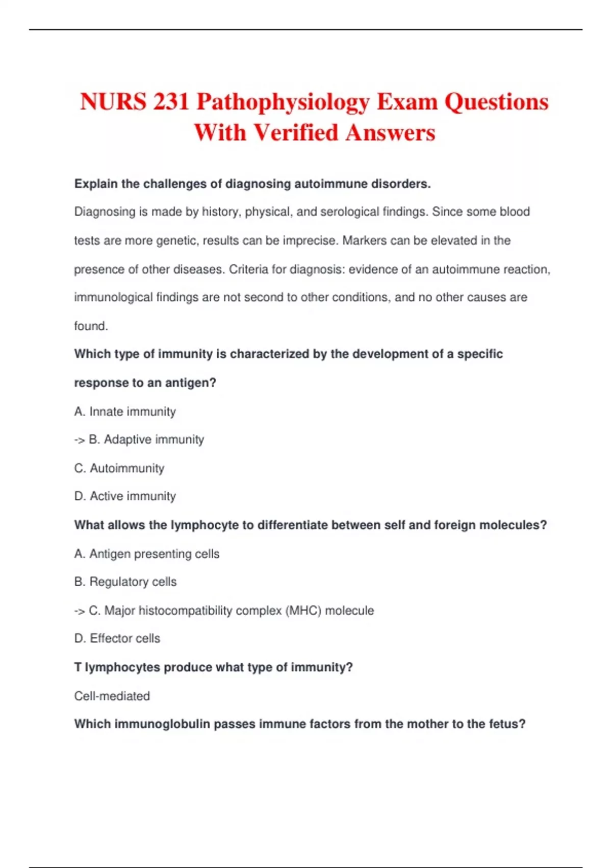 NURS 231 Pathophysiology Exam Questions With Verified Answers Explain the challenges of diagnosing autoimmune disorders. Diagnosing is made by history, physical, and serological findings. Since some blood tests are more genetic, results can be imprecise. Markers can be elevated in the presence of other diseases. Criteria for diagnosis: evidence of an autoimmune reaction, immunological findings are not second to other conditions, and no other causes are found. Which type of immunity is characterized by the development of a specific response to an antigen? A. Innate immunity -> B. Adaptive immunity C. Autoimmunity D. Active immunity What allows the lymphocyte to differentiate between self and foreign molecules? A. Antigen presenting cells B. Regulatory cells -> C. Major histocompatibility complex (MHC) molecule D. Effector cells T lymphocytes produce what type of immunity? Cell-mediated Which immunoglobulin passes immune factors from the mother to the fetus? A. IgM B. IgA -> C. IgG D. IgD E. IgE Which cell type is an early respon