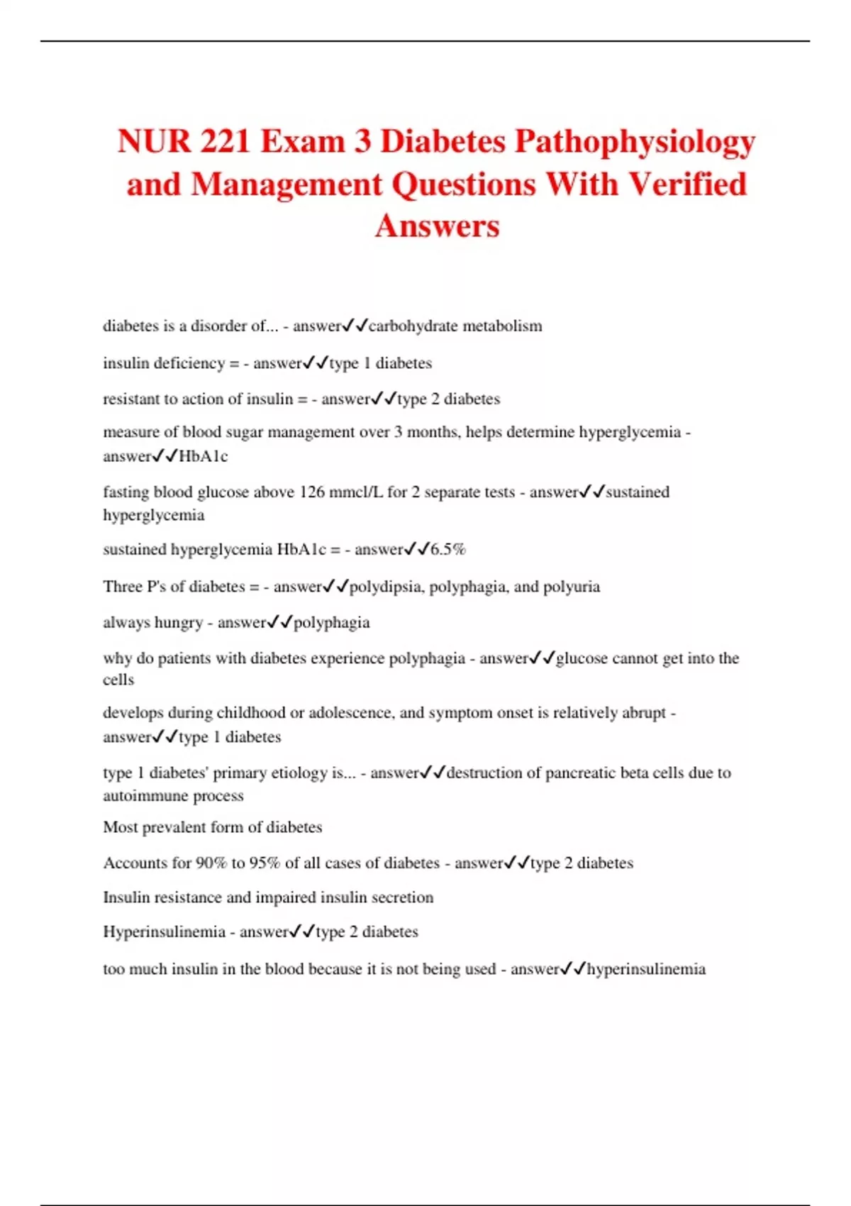 NUR 221 Exam 3 Diabetes Pathophysiology and Management Questions With Verified Answers