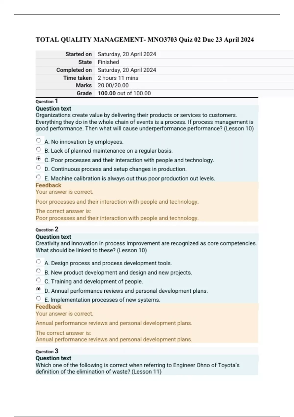 TOTAL QUALITY MANAGEMENT- MNO3703 Quiz 02 Due 23 April 2024